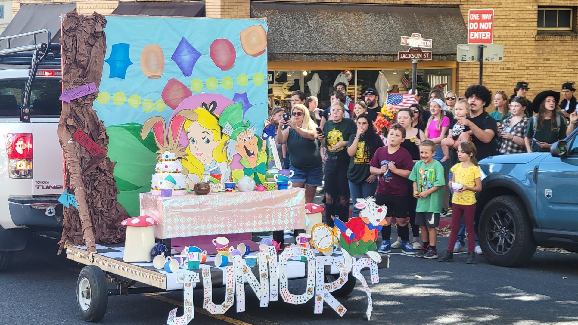 Sonora, CA — The streets of downtown Sonora are back open again after becoming crowded with Sonora High School fans at 2:15 pm this afternoon for the Homecoming Parade. Students in the Golden Regiment Band marched down Washington Street. The football team, cheerleaders, and homecoming court rode on various vehicles including the Tuolumne Sheriff’s Dept. MedCat. The theme of the four class floats is Storybook with Seniors choosing Rapunzel, Juniors choosing Alice in Wonderland, Sophomores are Beauty and the Beast, and Freshmen are Little Mermaid. The local shops on Washington Street also have decorations.