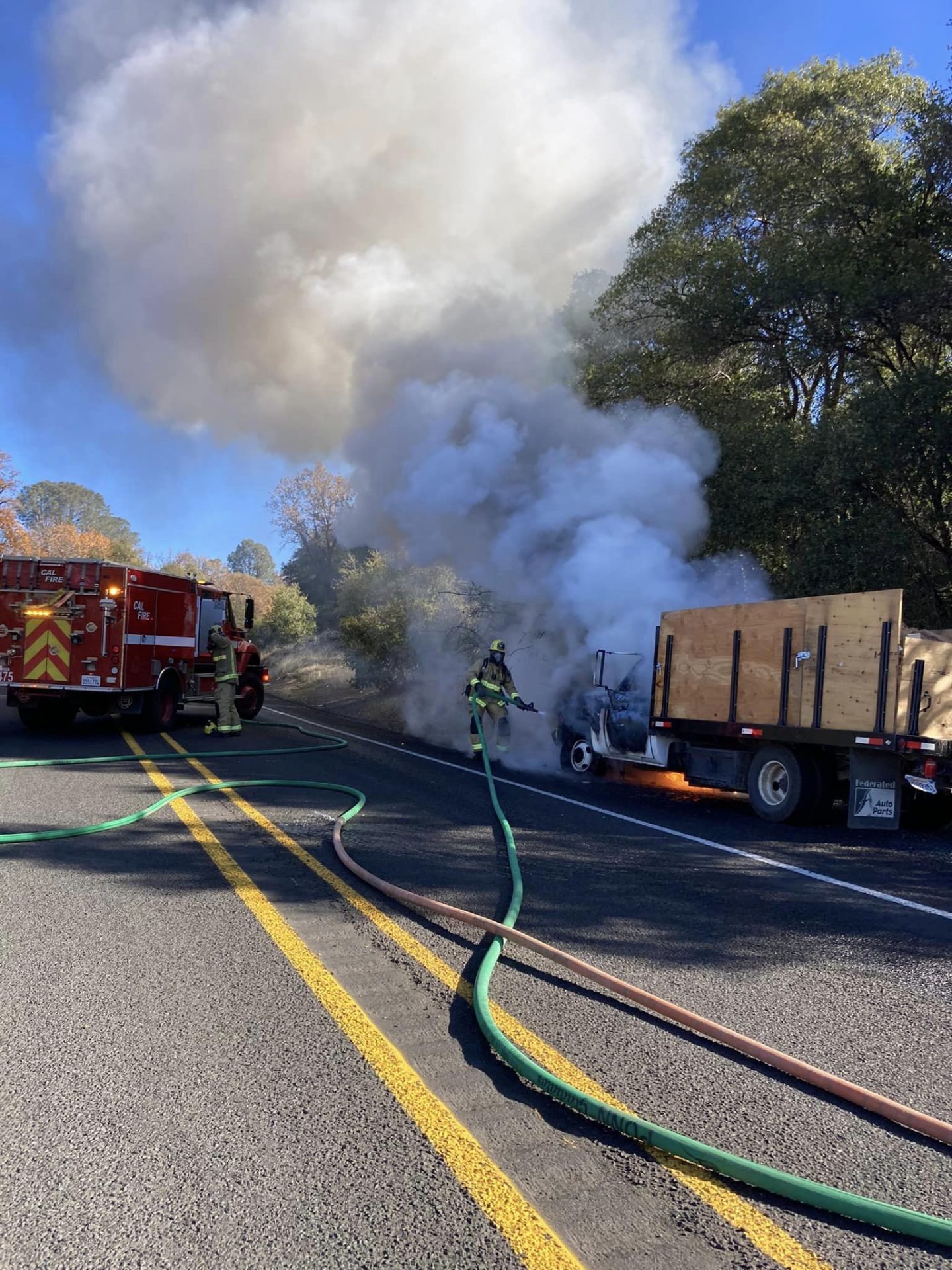 CAL Fire has dubbed it the Morris Fire, as it is close to Morris Road and west of Woodham Carne Road in Sonora. The engine of a truck hauling cut wood caught fire. Flames and a plume of smoke can be seen shooting out from under the hood in the image box photo.