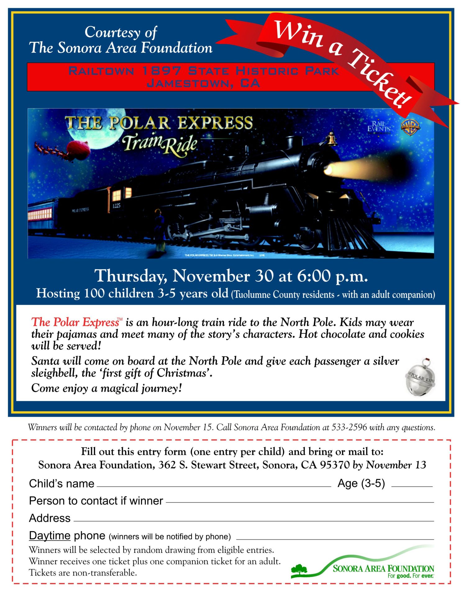 Sonora, CA — Each year the Sonora Area Foundation sponsors 100 children on a great adventure named The Polar Express™. The Board of Directors will draw the names of 100 children, ages 3 to 5 years old, who will travel by railroad to the “North Pole” with an adult companion.