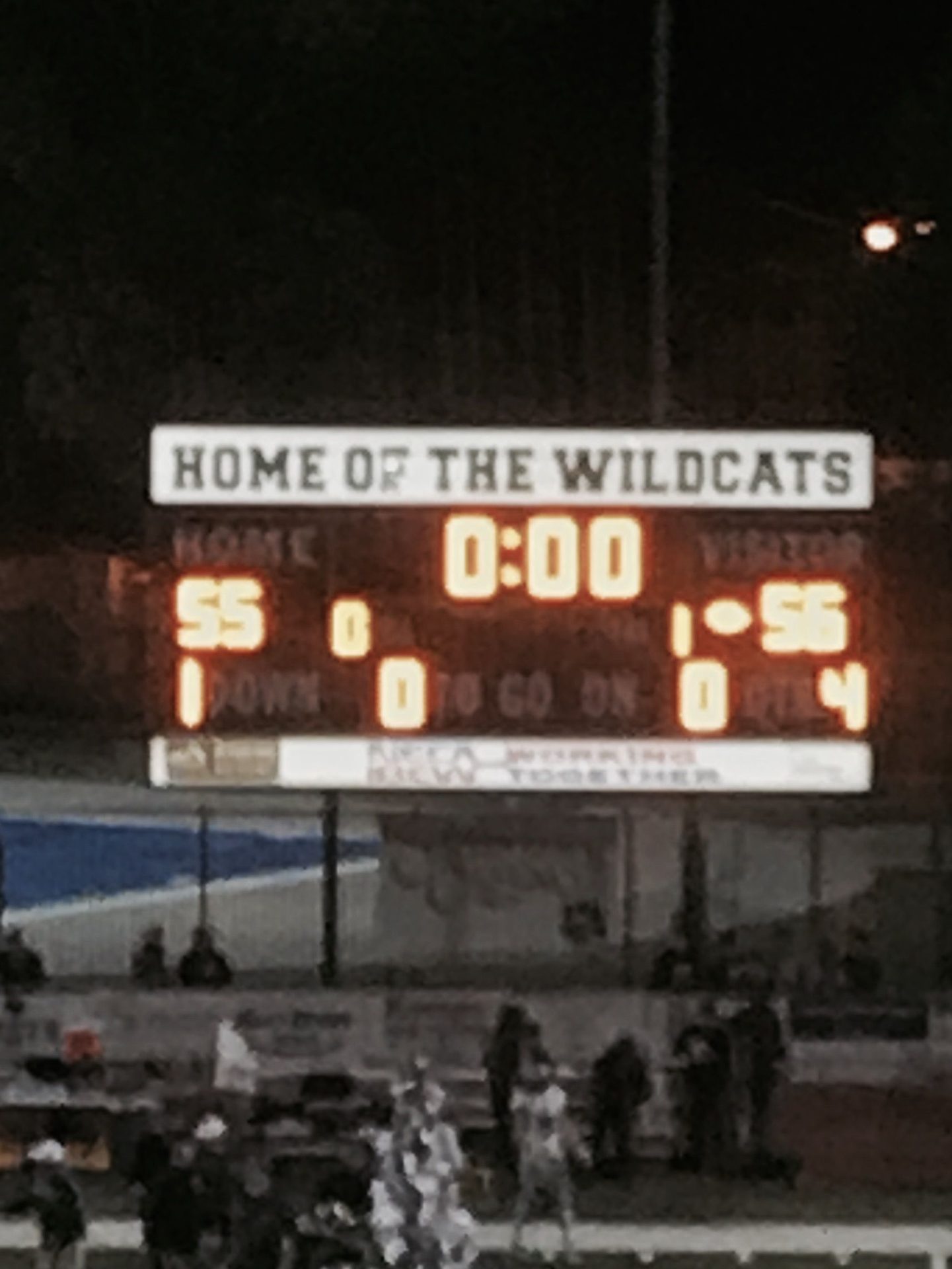 Sonora, playing to win, decided to go for the two-point conversion.This was the season for both teams, with the winner heading to the section championship. After a Colfax time out, both teams would line up. As the steam rose off the 22 players digging in for what was surely the most important play of the game, an anxious filled quietness fell over Dunlavy. As the ball was snapped, the sounds of shoulder pads exploded through the air. As both teams collapsed into the center of the line, Gookin would take it right up the middle and as he stretched out to break the plane of the goal line, he was stopped just short by the Colfax defense. With the two-point conversion failing, the Wildcats were down one with seconds left, 55-56. Sonora had one last opportunity to get the ball back on the kickoff. With Colfax moving forward expecting an onside kick, the Wildcats special teams kicked to an area devoid of Eagle players and raced down the field in an attempt to get the ball back. Unfortunately, it was not to be as an Eagle receiver was able to beat out the Wildcats and Colfax would have the ball. The Eagles came out for the last play and were able to kneel on the ball ending the Wildcat 2017 football season.