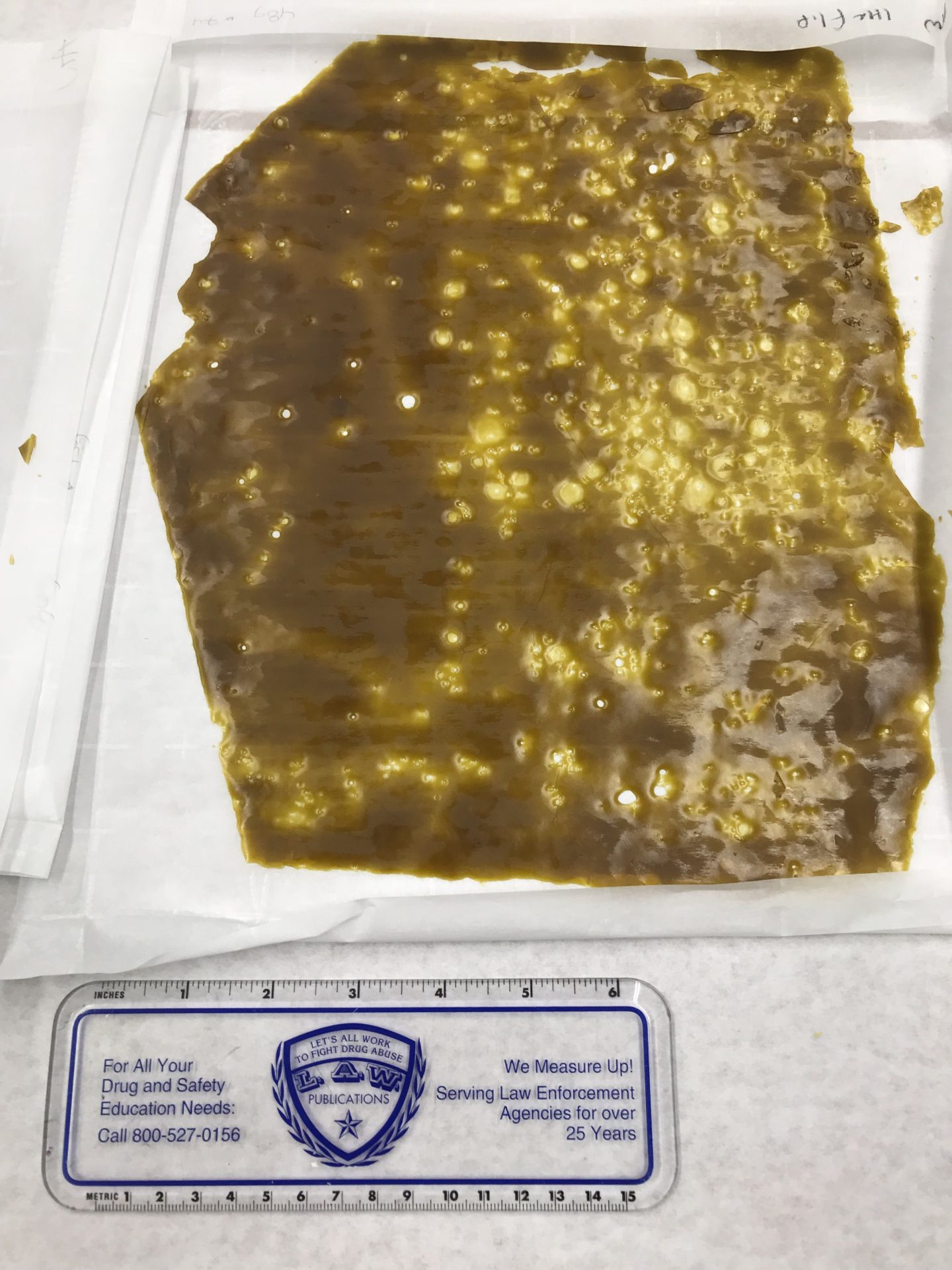 A passing vehicle caught the eye of an officer as it had no rear license plate light. After being pulled over, the driver, 27 year old Oscar D. Merino, of Baldwin Park near Los Angeles, could not produce a driver’s license, which prompted a records check the revealed it was suspended. During a search of his vehicle’s cargo area, an officer discovered a cardboard box with 54 separate sheets of waxed paper and on each was a smear of concentrated cannabis as seen in the pictures in the image box. Commonly referred to as “Butane Honey Oil,” “Wax,” or “Dabs,” according to police.