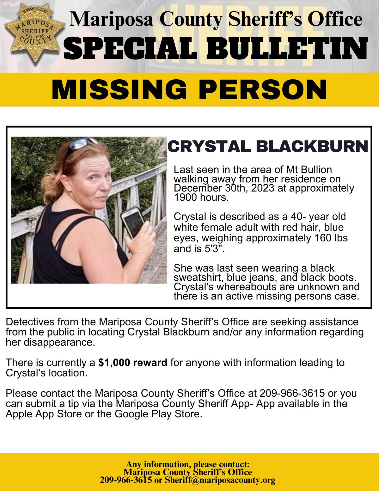 Crystal Blackburn, last seen on December 29, 2023, in Mt. Bullion, is described as a white female with red hair, blue eyes, and a height of 5’3″, weighing approximately 160 lbs. Blackburn was last seen wearing a black sweatshirt, blue jeans, and black boots. A $1,000 reward is also offered for information on her whereabouts.