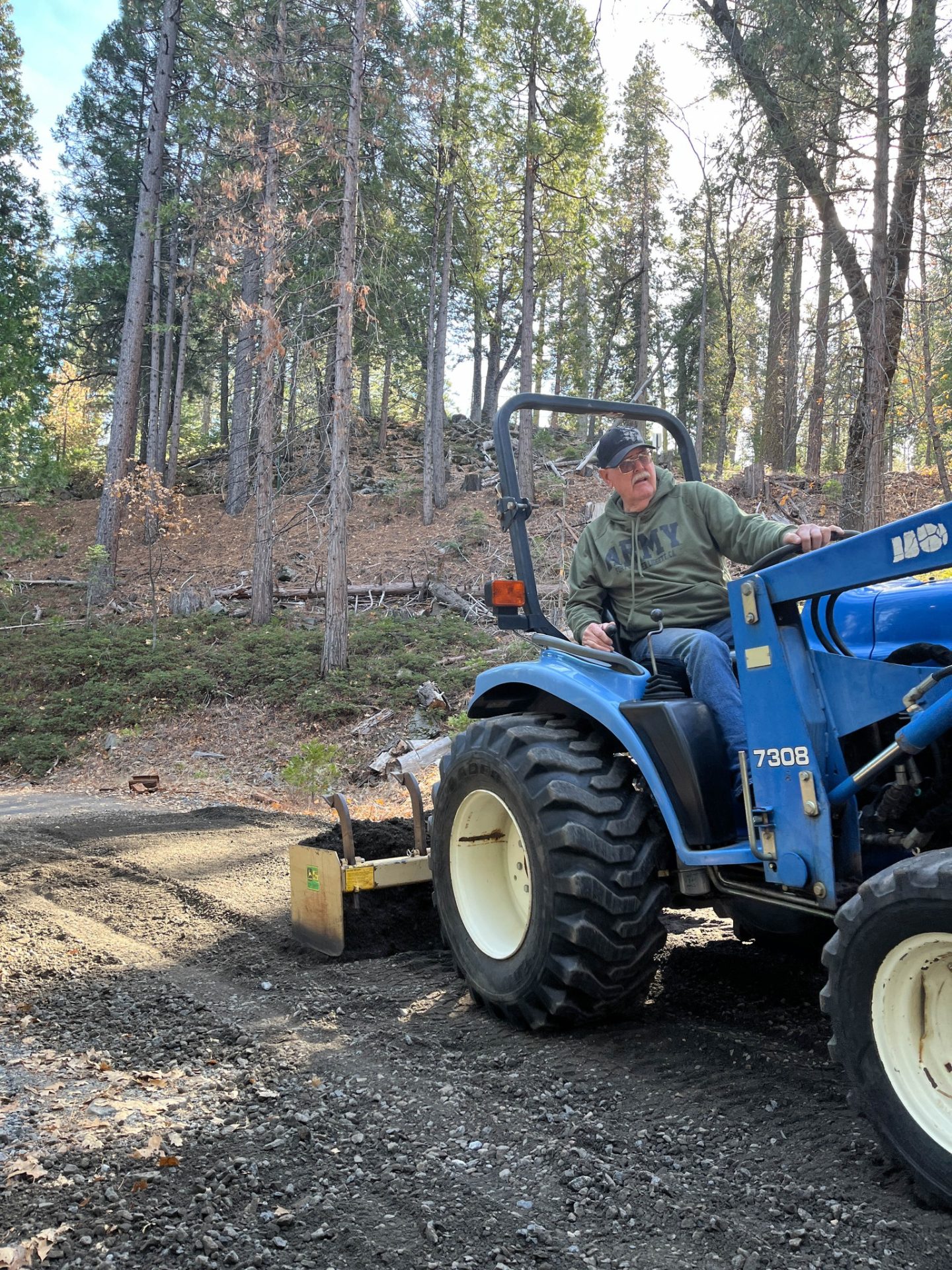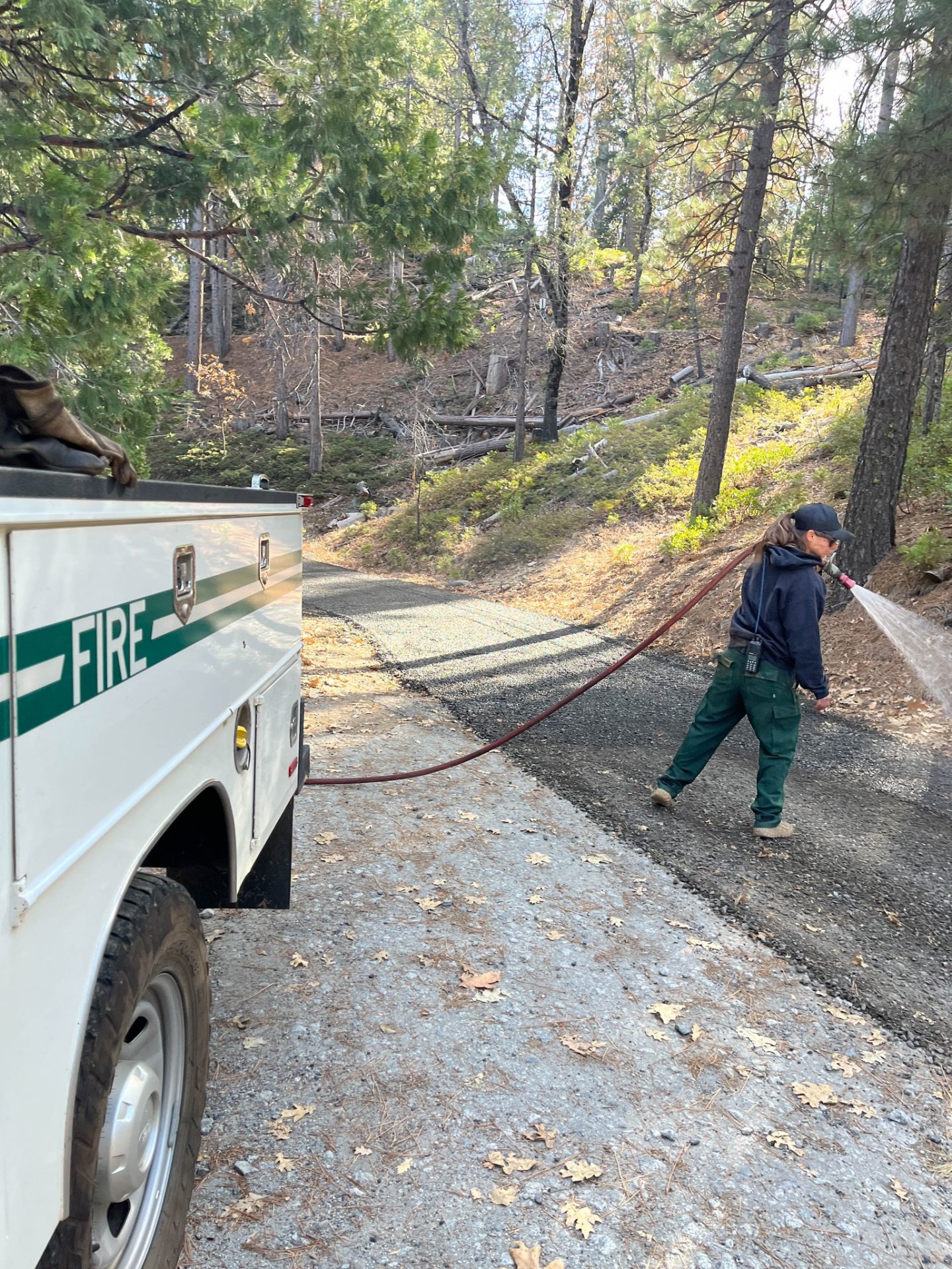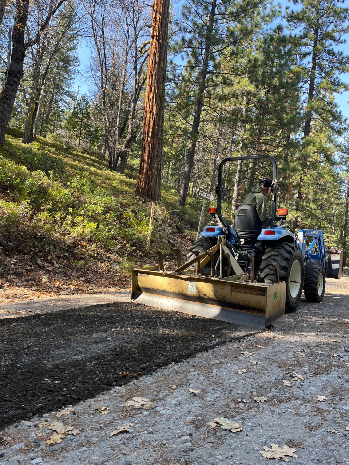 Pictures in the image box show the work done by several groups who volunteered and completed the work. Hetch Hetchy Power volunteered their dump trucks to deliver the material, Tuolumne County Sportsmen Inc. volunteered their time and tractor equipment to spread the gravel along the route and our Groveland fire prevention crew came out with water tanks to spray the road to help with compaction.