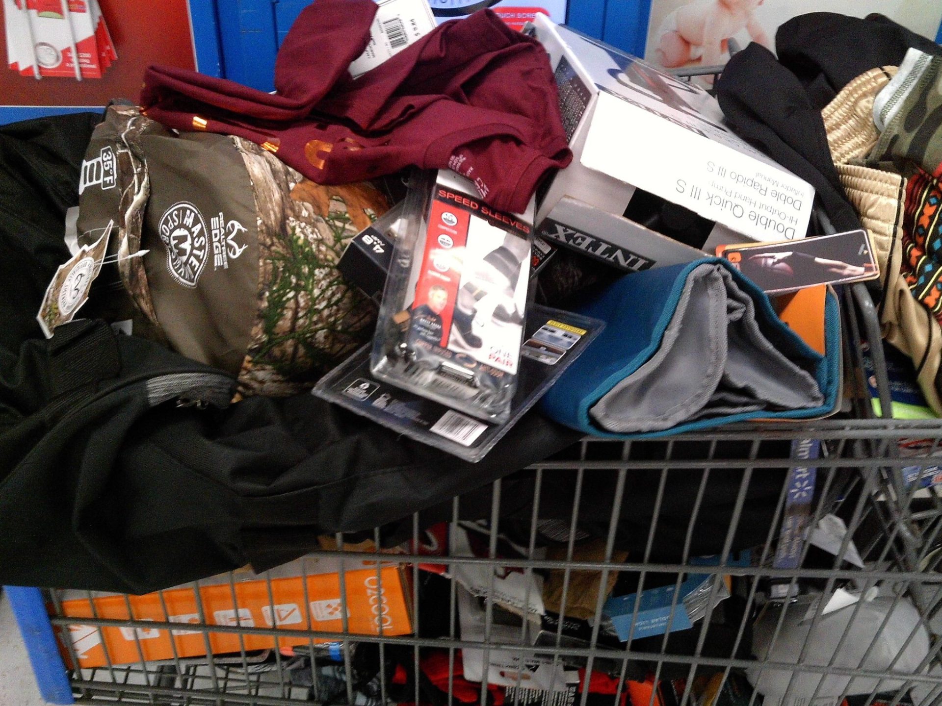 Sonora, CA – A Walmart customers was stopped by staff as he tried to roll a cart full of items out of the store without actually purchasing the products.