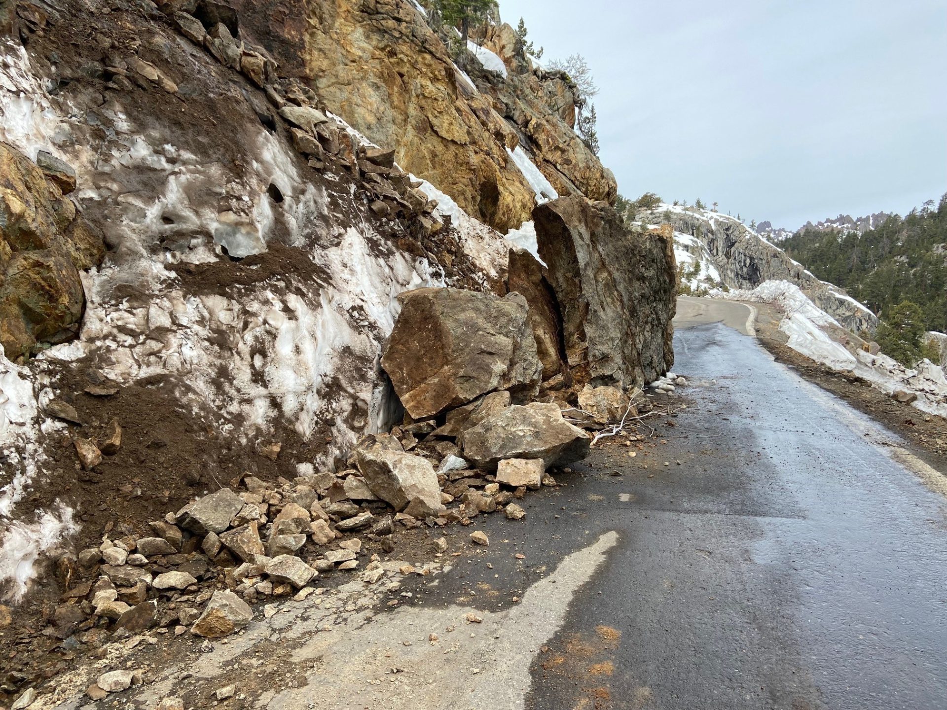 Caltrans officials relayed that it restricts motorists’ and pedestrians’ access on the passes during clearing operations each spring for safety reasons. The picture in the image box shows why that is done, as on Wednesday, the Woodfords Maintenance Crew was clearing Ebbetts Pass and came upon a 13 x 9-foot boulder in the roadway. Caltrans relayed that crews safely removed the debris and continue their pass-clearing operations.