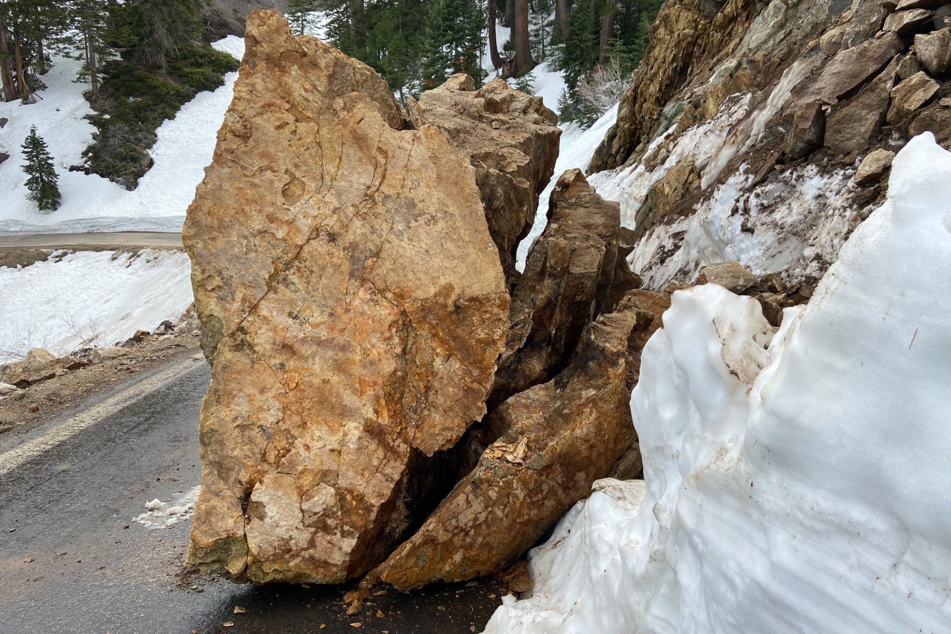 • Large boulder blocking the Highway 4 Ebbetts Pass that had to be removed -- Caltrans District 10 photo