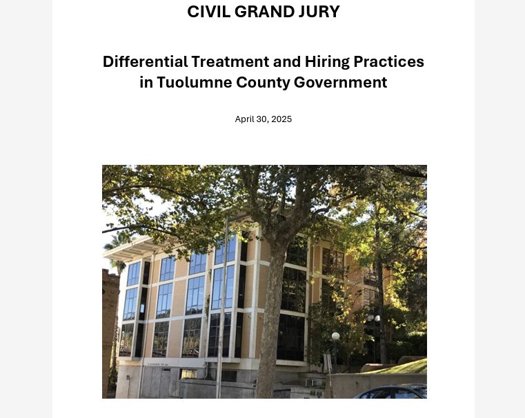 Sonora, CA — Alleged differential treatment to a certain group of close employees and poor hiring practices were highlighted in a new Tuolumne County Grand Jury Report.