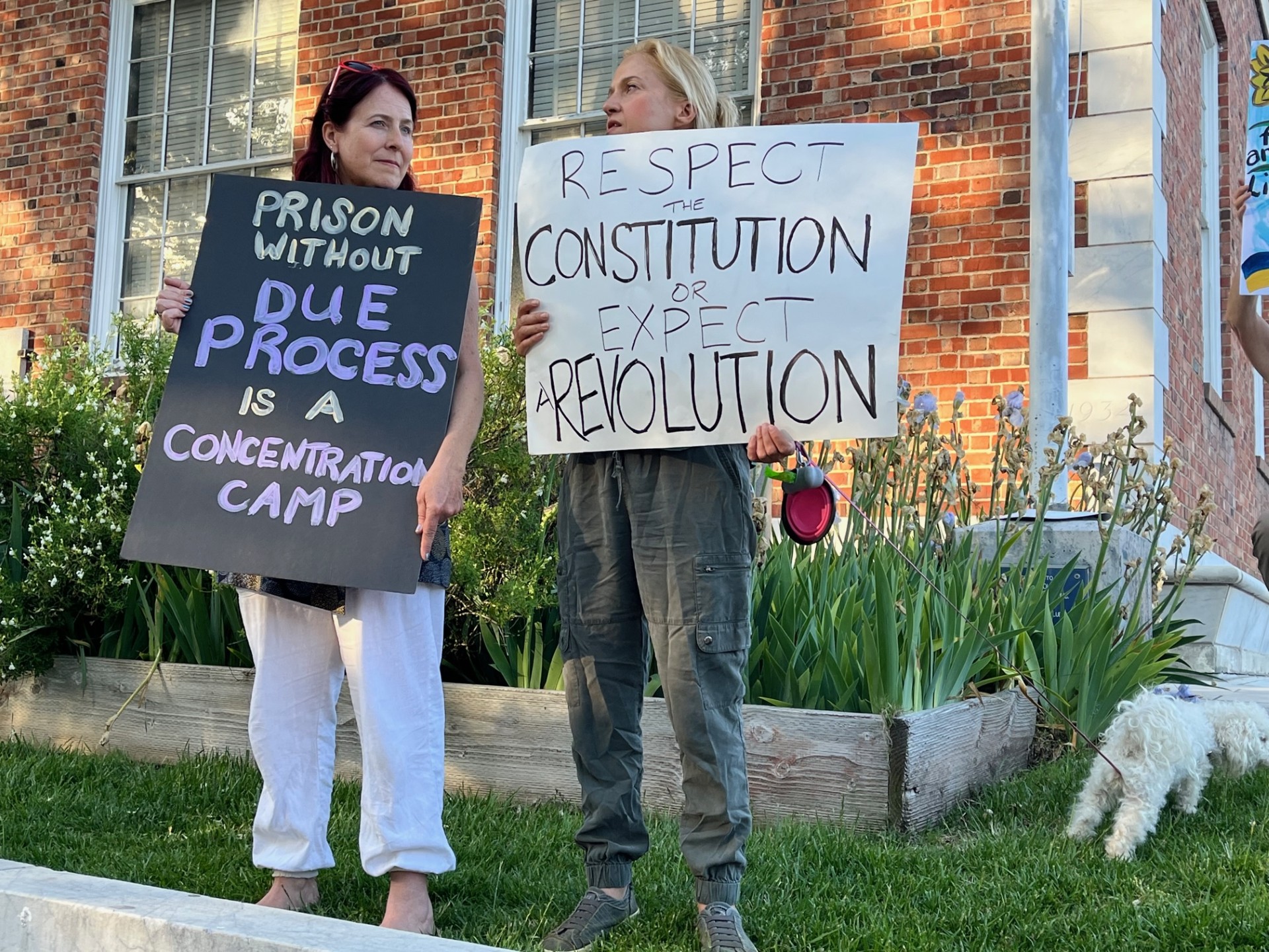 Other signs had slogans including, “Hands off social security,” “Impeach the Mafia Don,” “Respect the Constitution or Expect Revolution,” “Veterans Against Trump,” and “Prison without due process is a concentration camp.”