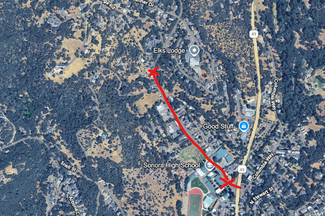 The maps in the image box show where the work is being conducted, on Thursday, on Shaws Flat Road, between Keeley Drive and just past the Saratoga Road intersection. Then on Friday, continuing along Shaws Flat Road passed Sonora Union High School to the Highway 49 intersection.