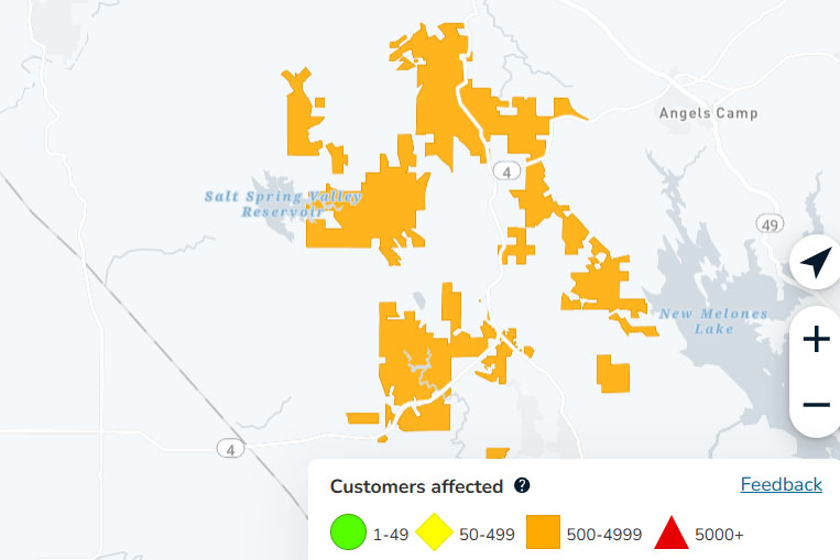 Update at 6:50 a.m.: PG&E reports that a power outage this morning on the west side of New Melones that was impacting 828 customers has dropped to 134 customers as crews are working to repair equipment.