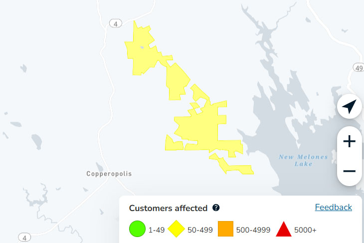 Original post at 6:04 a.m.: Copperopolis, CA — More than 800 PG&E customers are without electricity this morning in the Copperopolis area and on the west shores of New Melones Lake.