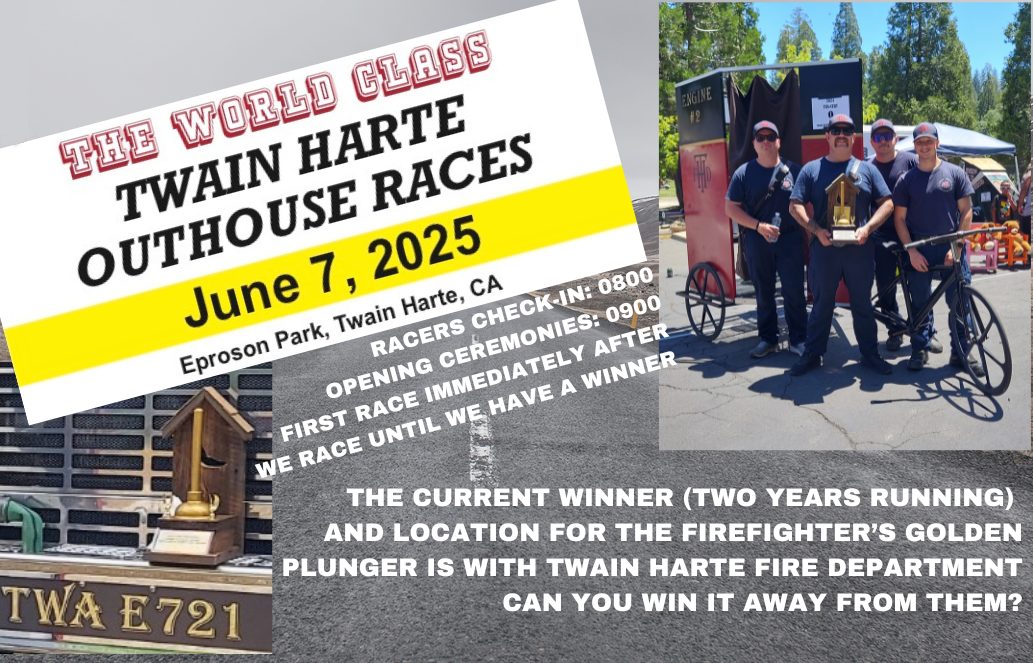 The unique annual race was first held in 2014 and is organized to raise money for the Twain Harte Volunteer Fire Department and the Twain Harte Community Emergency Response Team (CERT). Last year the event contributed to the purchase of an automated external defibrillator (AED), a medical device designed to analyze a heart’s rhythm and deliver an electric shock to restore the heart rhythm to normal.