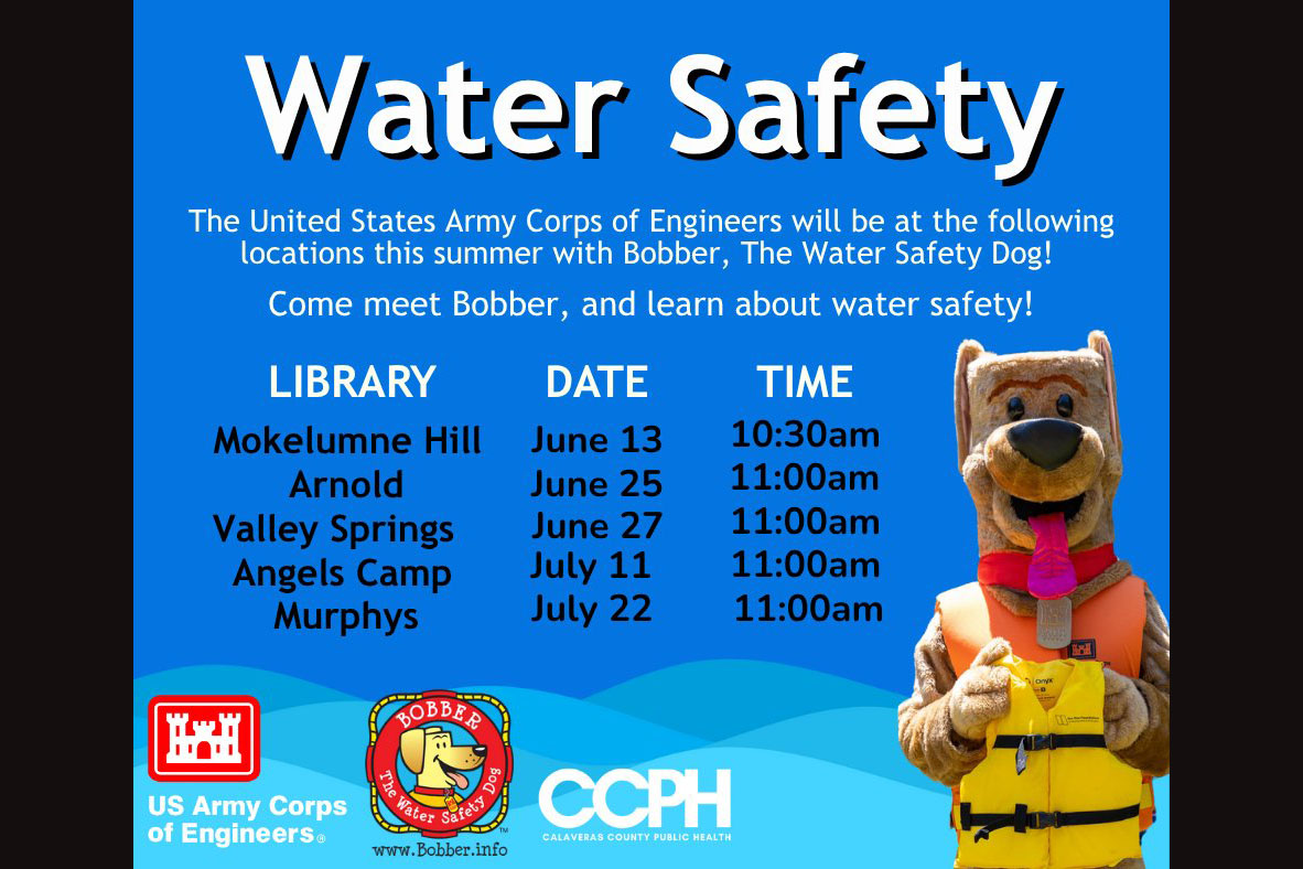 Bobber the Water Safety Dog, with the United States Army Corps of Engineers, started his tour today at Mokelumne Hill Library and will continue with events at the libraries listed in the image box photo. Bobber teaches families how to stay safe around water this summer, and California statistics like these are proof that it is needed. The state is one of three with the highest drowning rates, along with Florida and Texas. When parents were questioned about home safety worries, drowning was only mentioned by 1% of parents, despite being the top cause of injury-related mortality in the home for children aged 1 to 4.