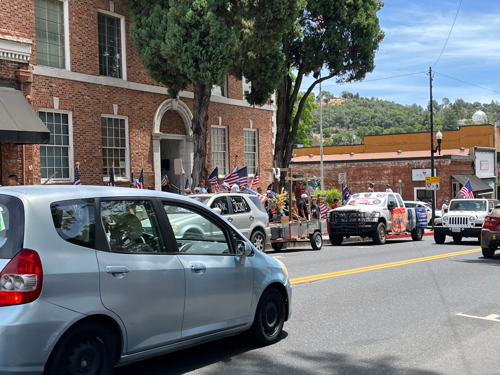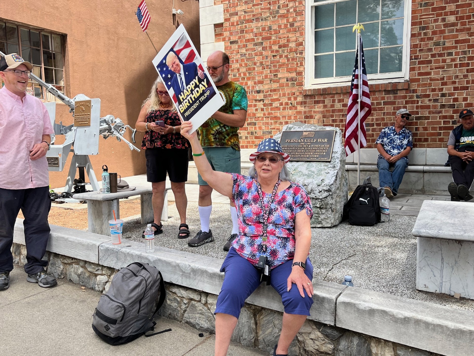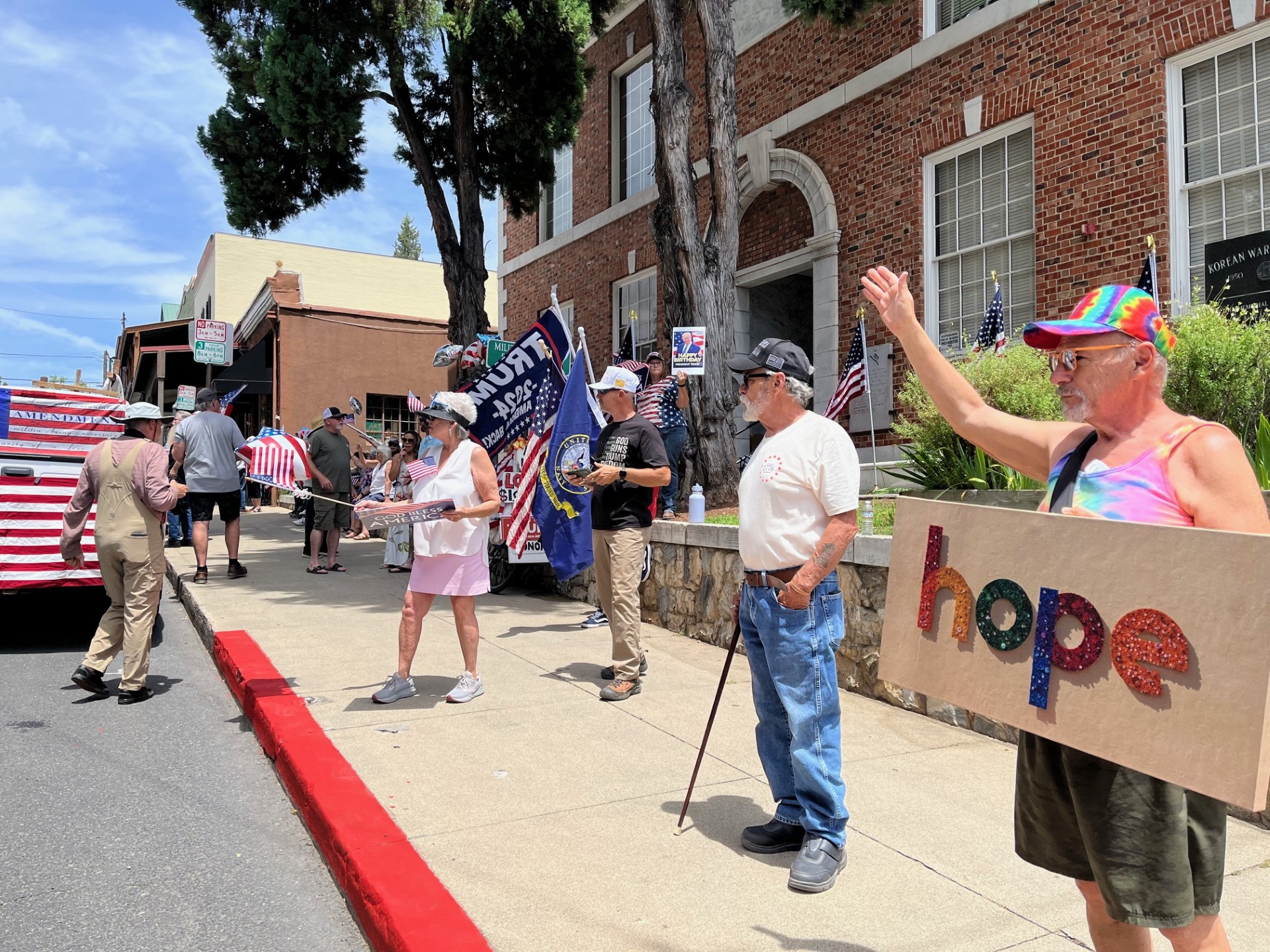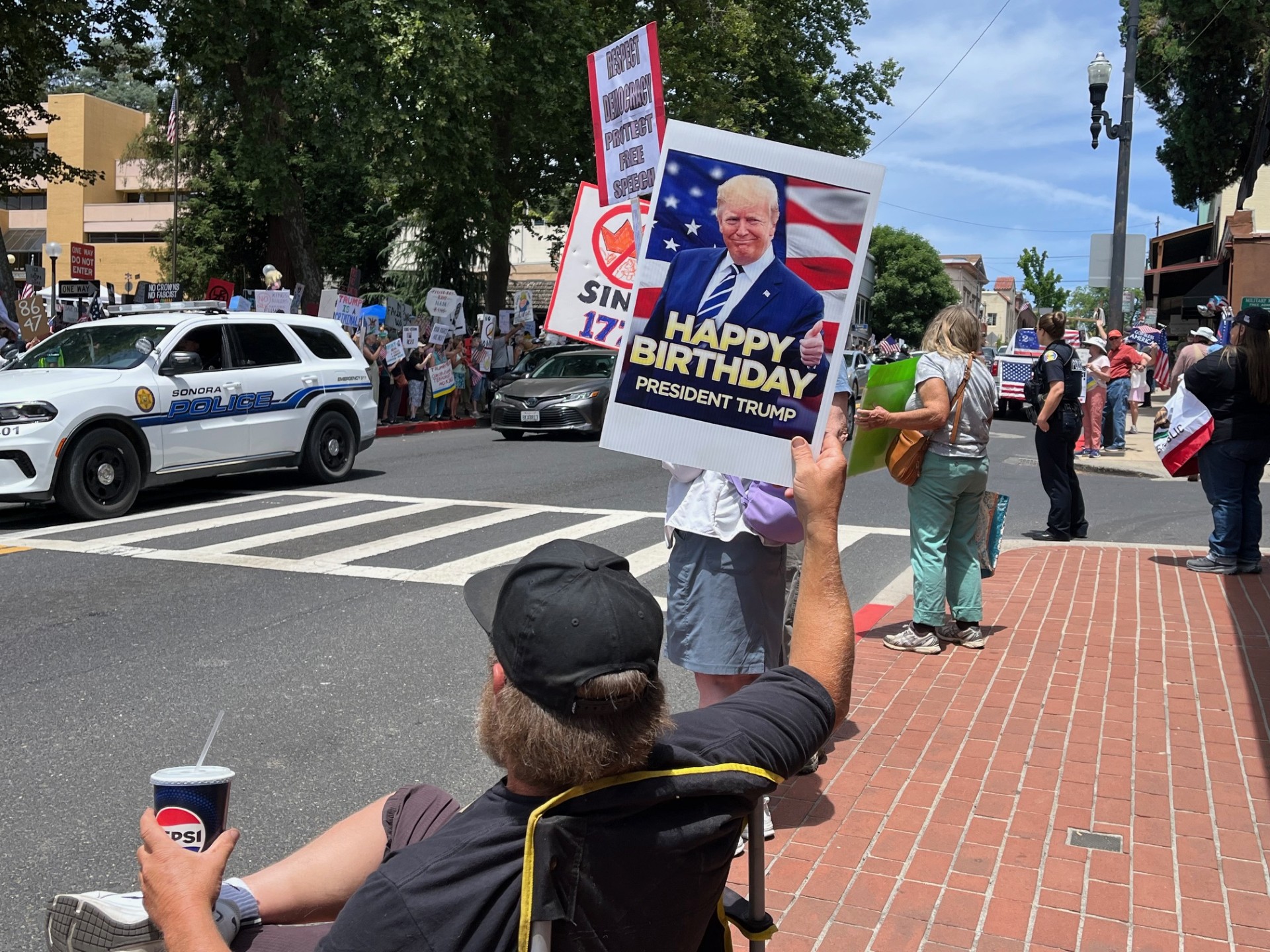 This rally coincided with Flag Day, the military parade in Washington, D.C., commemorating the 250th birthday of the army, and President Donald Trump’s birthday, which was celebrated by about 20 counter-protestors across from the park in front of the Tuolumne County Veterans Hall and Museum on North Washington Street, who chanted and held signs of mostly “Happy Birthday” to the president, Trump 45/47, and “God Bless America.”
