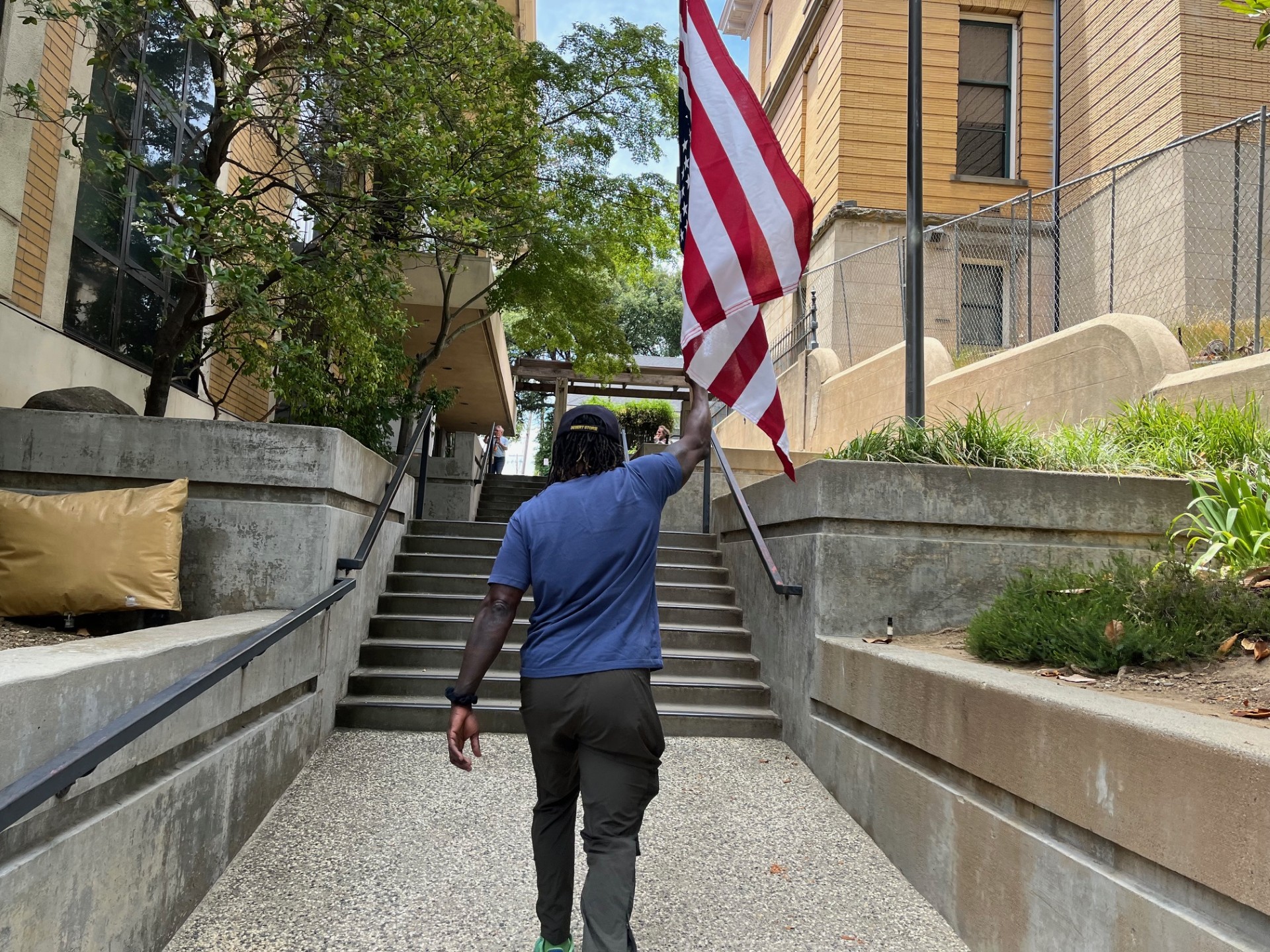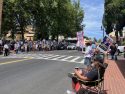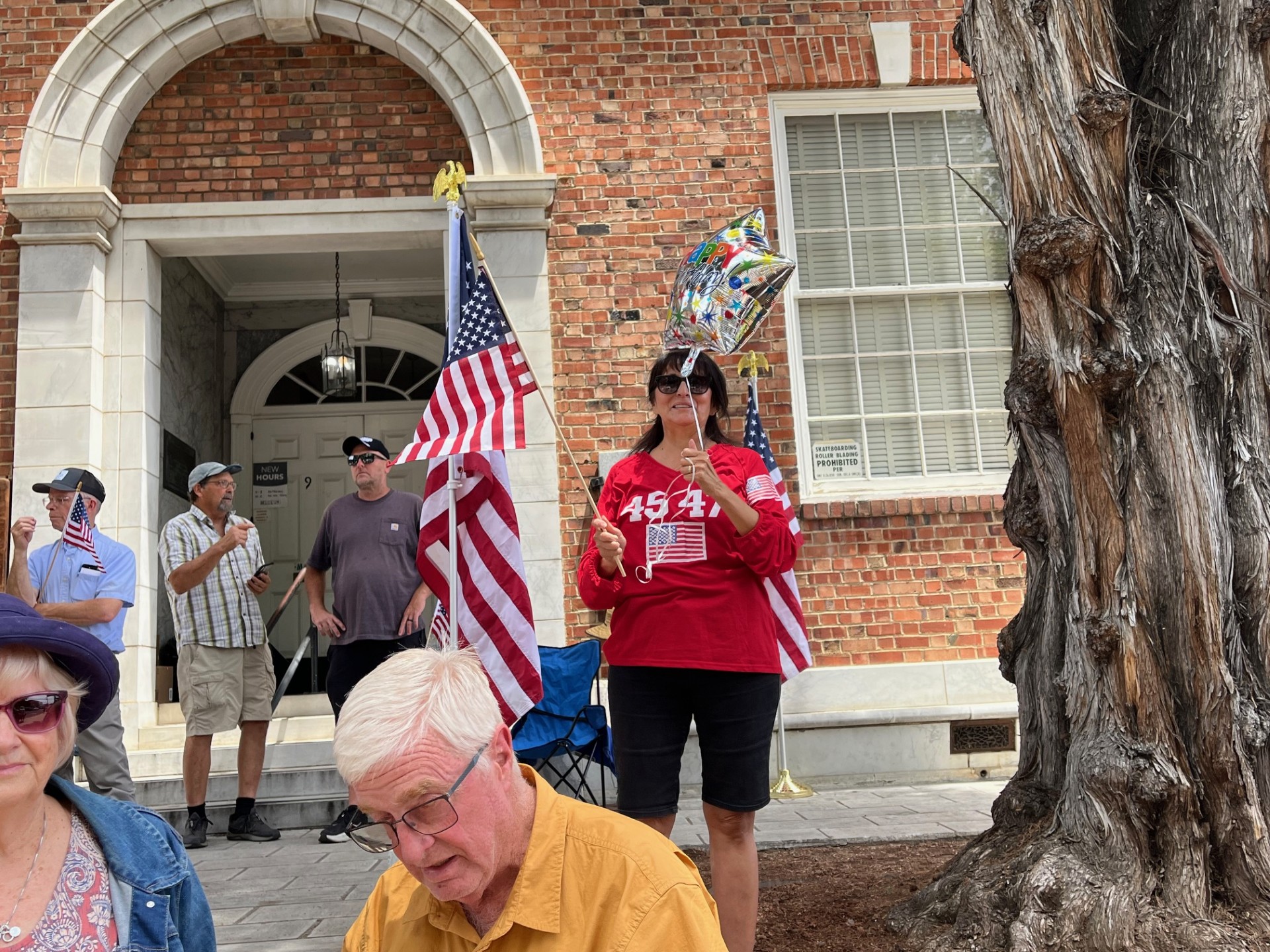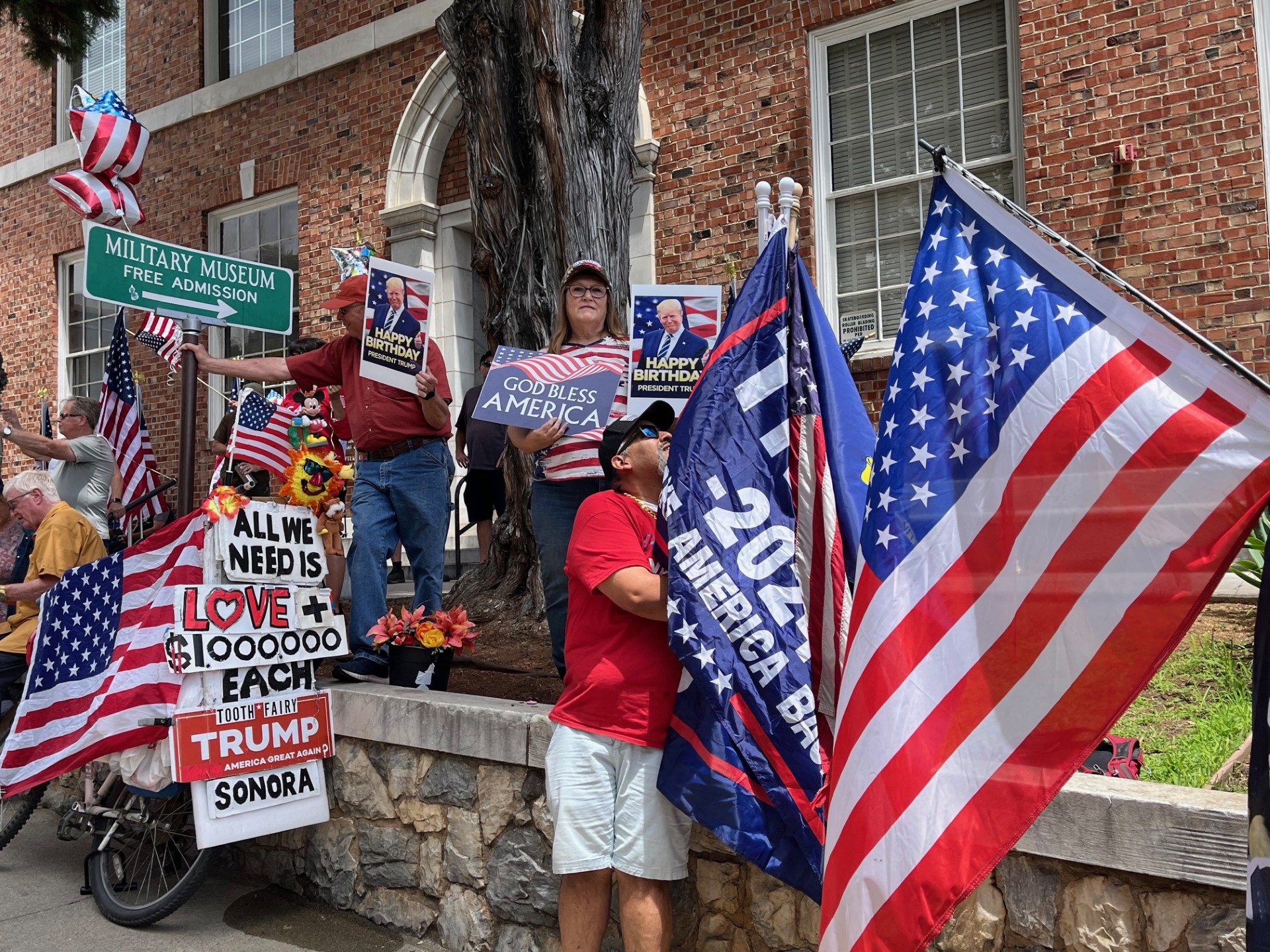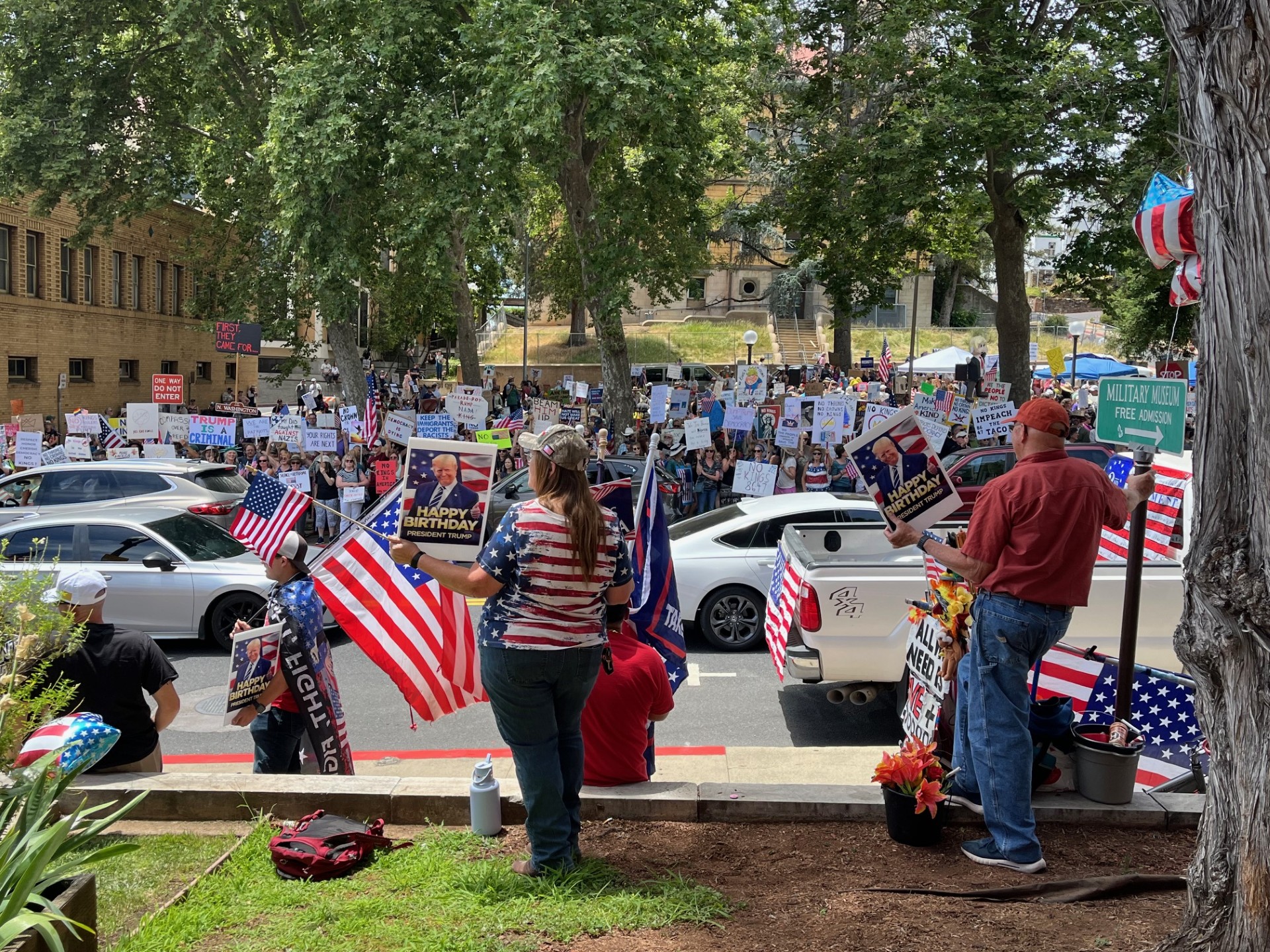 This rally coincided with Flag Day, the military parade in Washington, D.C., commemorating the 250th birthday of the army, and President Donald Trump’s birthday, which was celebrated by about 20 counter-protestors across from the park in front of the Tuolumne County Veterans Hall and Museum on North Washington Street, who chanted and held signs of mostly “Happy Birthday” to the president, Trump 45/47, and “God Bless America.”