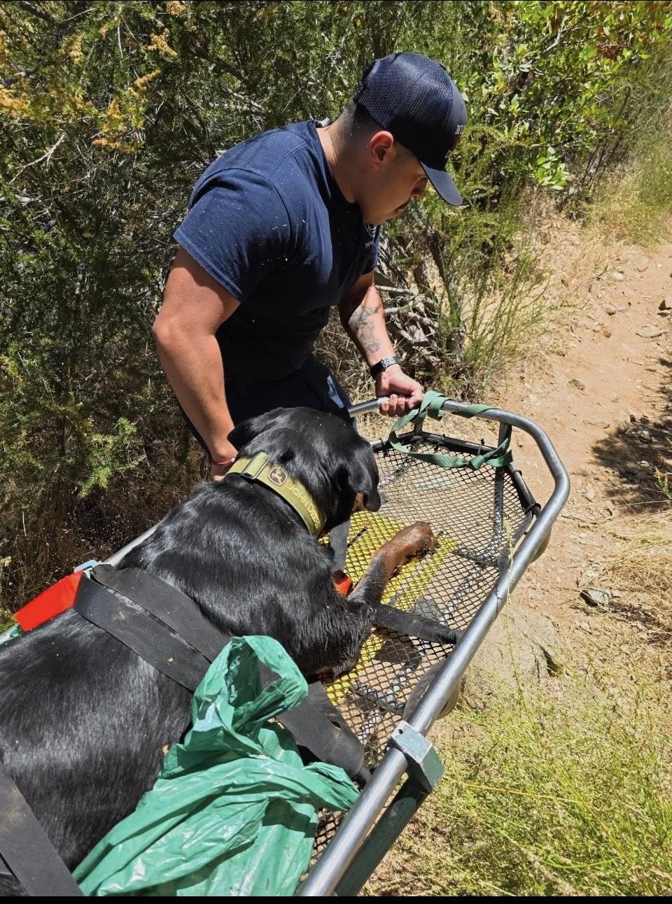 Murphys Fire Protection District and CAL FIRE TCU Engine 4482 responded Sunday, June 15, to the area of Parrotts Ferry Road and the New Melones Lake Bridge—known locally as “The Bomb” hike—after a dog named Nala began showing signs of heat illness about 1.5 miles from the roadway. Crews coordinated a three-hour rescue, using a wheeled litter and hand-carrying Nala back to a vehicle. Firefighters said the dog began improving after receiving water and a chance to cool down.