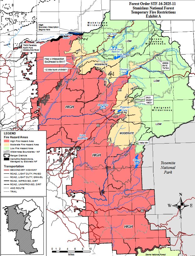 Sonora, CA– Temporary fire restrictions will go into effect July 1 across high fire hazard areas of the Stanislaus National Forest and remain in place through Dec. 31, 2025, officials announced Friday. The decision follows a week in which crews responded to five human-caused wildfires in the forest. All were quickly suppressed, with no reported damage to life or property.