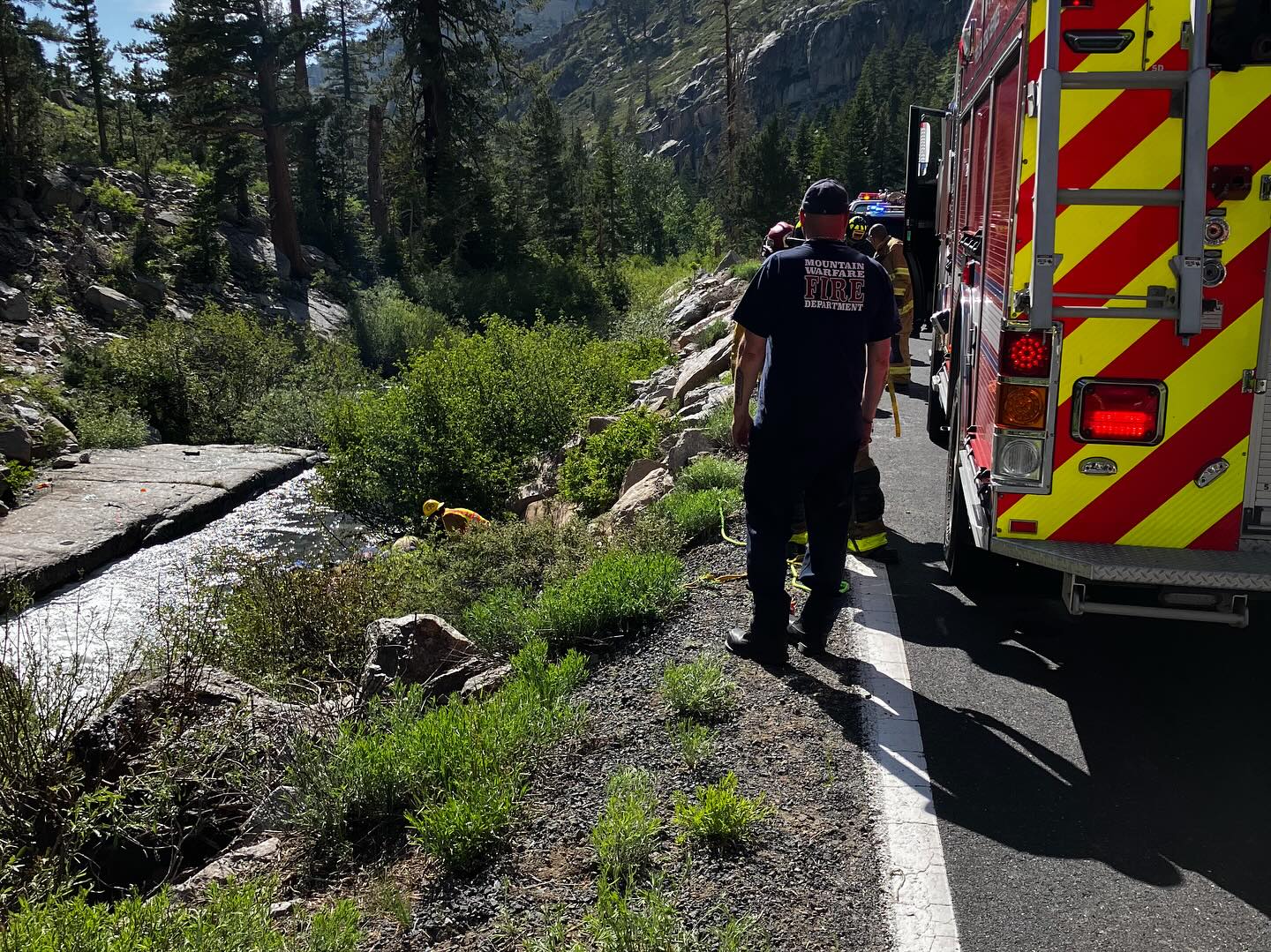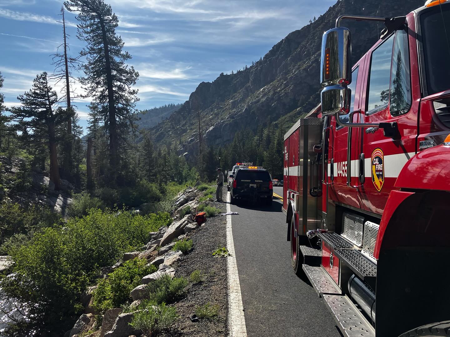 The CHP shut down Highway 108 for more than an hour while fire resources from TCFD, CAL FIRE TCU, Mountain Warfare Fire Department in Pickle Meadows, Bridgeport Fire, and Manteca District Ambulance worked a low-angle rope rescue to get to the victims, according to TCFD.
