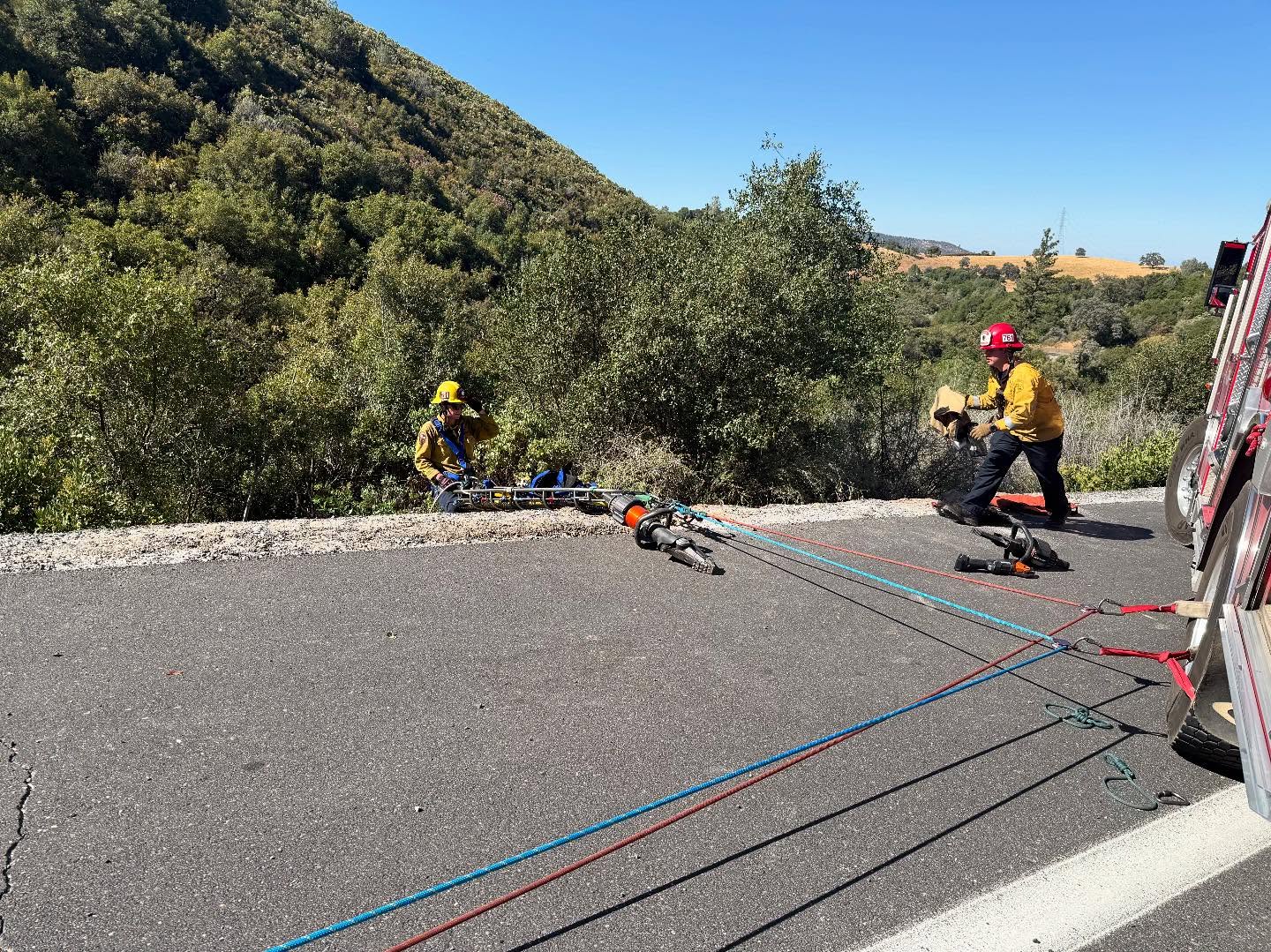 The Tuolumne County Fire Department (TCFD) reports that firefighters had to use chainsaws to cut the brush away to get to Lindo, trapped inside. They then began a rope rescue.