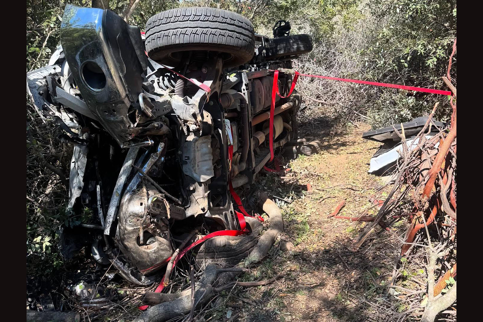 As we reported here earlier, the collision occurred at about 8:50 a.m. on Thursday (7/10) on Highway 120 west of Vasser Street, and a rope rescue was performed. The CHP reports that 46-year-old Christina Lindo of Manteca was driving a 2013 Ford F150 pickup westbound when, for unknown reasons, it went off the roadway and struck a paddle marker, hitting an embankment. The truck then crossed over the double-yellow lines, overturned while descending 35 feet, crashed into an embankment, and landed on its side in heavy brush.