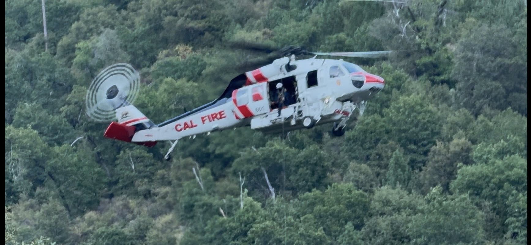 The incident occurred on Sunday (7/27) evening, east of Highway 4 off of Candy Rock Road and near the North Fork of the Stanislaus River. First on the scene was the Ebbetts Pass Fire Department (EPFD). While a paramedic was able to reach the woman, due to rocky and rugged terrain, they called in CAL Fire helicopter 601 from the Columbia Air Attack Base to hoist the injured woman from the scene, as shown in the photos.