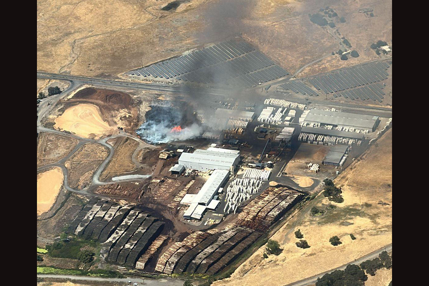 Update 2:14 p.m.: Air and ground resources have stopped the spread of the Sims Fire, a commercial blaze, at the SPI mill in Tuolumne County, according to CAL Fire spokesperson Emily Kilgore. She added, “Firefighters will remain at the scene for the next several hours mopping up.” The flames broke out around 1 p.m. in sawdust, debris, and logs at the mill, burning 1-2 acres of a pile. Luckily, fire crews were able to keep the fire from spreading to nearby vegetation.Â