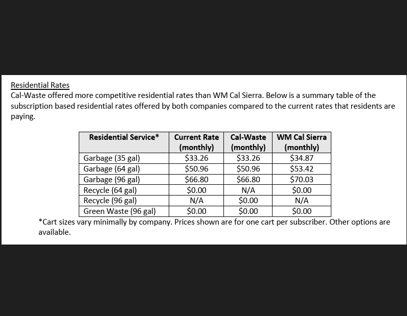 CAL Sierra Waste Management has also sent a separate letter to the city requesting that they be allowed to present the proposal directly to the council. The letter touts the company’s responsiveness, high accuracy rate, and commitment to the community with its local employees.