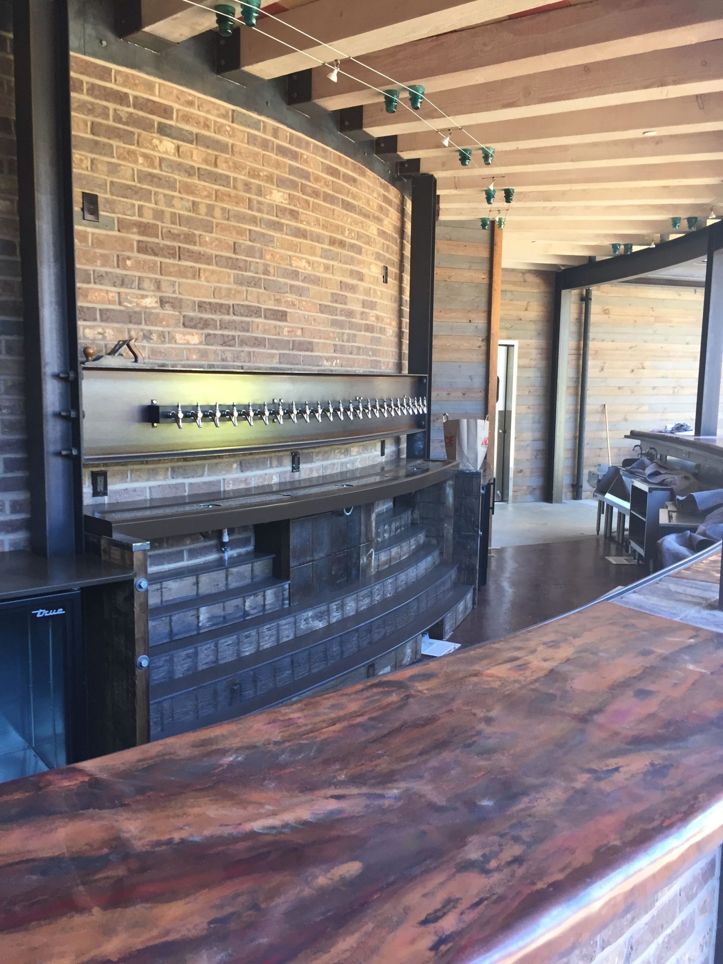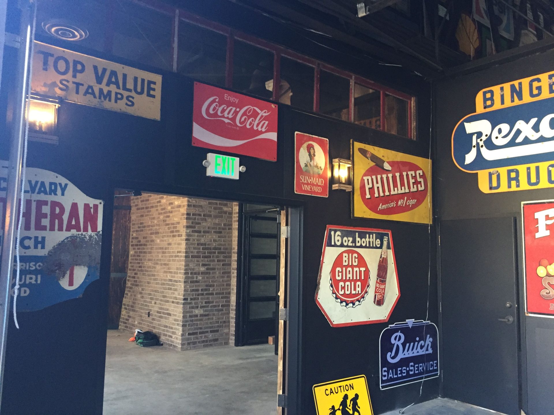 A gleaming, fully-loaded quarter of a million dollar kitchen sits nearly ready to use. Throughout the entire space, repurposed wood features from old local buildings and hand-picked Americana antiques are cleverly installed; including in the bathrooms, where old license-plates decorate stall doors and the men’s room urinals are made from beer kegs. Huge planters in the biergarten await the installation of mature trees and a plumbed housing cavity awaits a custom water feature. Kennedy notes that artist Judy Grossman is still set to paint a commissioned wall mural of the Green Dog Beer Company logo.