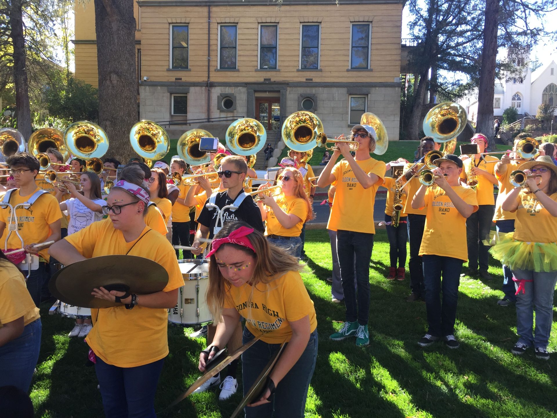 Sonora, CA– Wildcat fans took over downtown Sonora to celebrate Sonora High School’s Homecoming. Courthouse park was crowded with all ages of Sonora High School Wildcat fans before and after the parade of football players, cheerleaders and the Golden Regiment Band marched down Washington Street. Students nominated for the homecoming court rode on various vehicles along with each class’s float as seen in the photos.