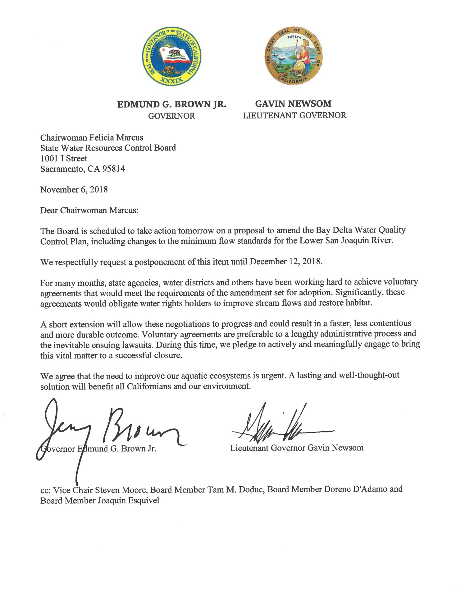 Governor Jerry Brown, who leaves office on Jan. 7, and Lieutenant Governor Gavin Newsom, who will be sliding into his seat, requested the delay in a formal letter dated Tuesday. He further emphasized during a Wednesday media interview at his office that he intends to use his remaining weeks to push among water users long at war over the Sacramento-San Joaquin river delta for a negotiated agreement.