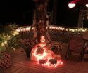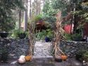 I thread twinkle lights through the corn stalks and light up the ceramic pumpkins. Bright red leaves of the Tupelo tree and yellow maple leaves are all mixed in as a matrix for the gourds to lie on. I begin at the opening stone wall of my garden with the display, continue decorating on the deck and finish with a big display in the house.