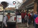It was the first bean feed where Mutz was not in charge but his iron pot was still in use. Clarke Broadcasting caught up with the bean feed founder before he rang the bell at high noon as shown here. At noontime the waiting line stretched back before Coffill Park as locals, many dressed or accessorized for the holidays, stood and chatted with their neighbors.
