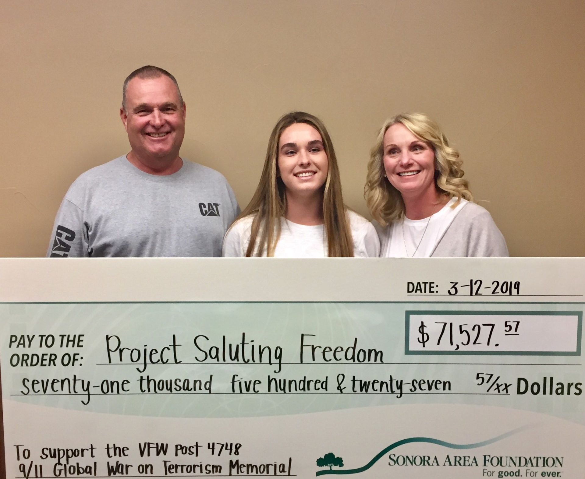 On her lunch break Tuesday, Candace Olsen, who attends Summerville High, appeared at the Sonora Area Foundation offices to present a check for $71,577.57 to the Project Saluting Freedom. Among those on hand to receive the monies were Veterans of Foreign Wars Post 4748 Commander Aaron Rasmussen, an Iraq veteran, and Project Chair Frank Smart, who served during the Vietnam War.