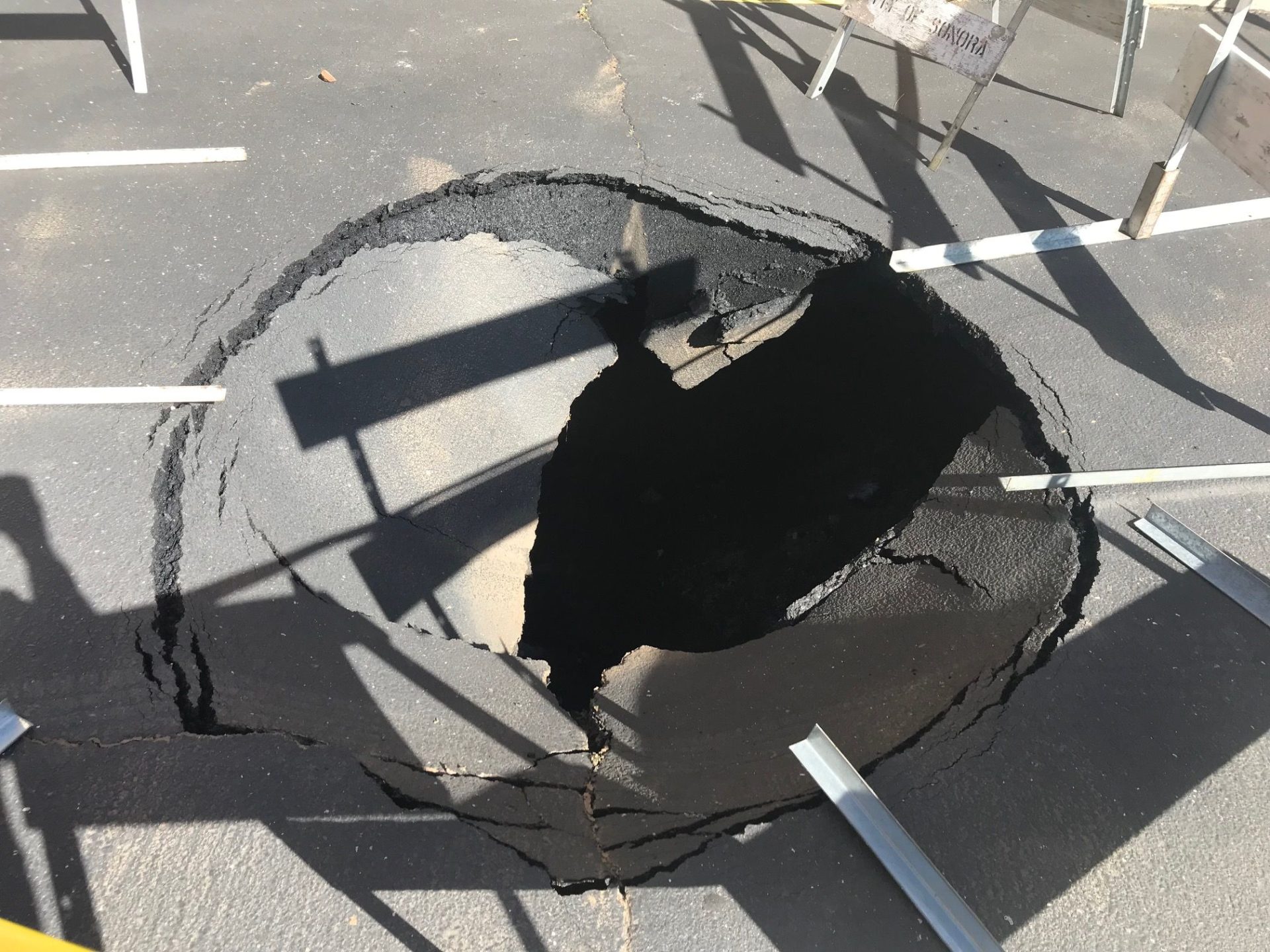 There is a notable sinkhole in the parking lot behind the Bank of America building at 180 South Washington Street.