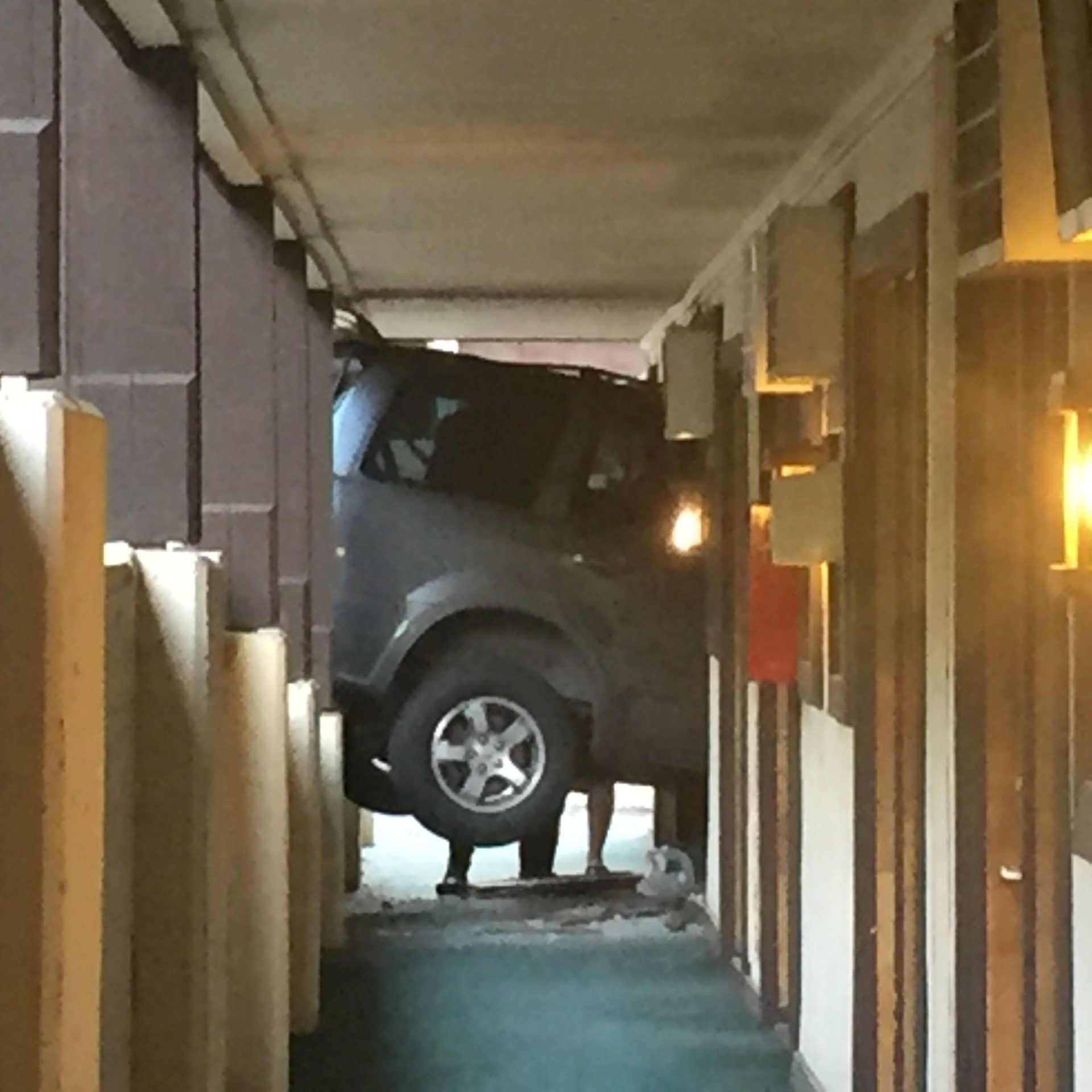 A tow truck arrived to pull the SUV out of the room, while motel maintenance covered the hole with plywood. There is no word on an estimated cost of damage to the building at this time.