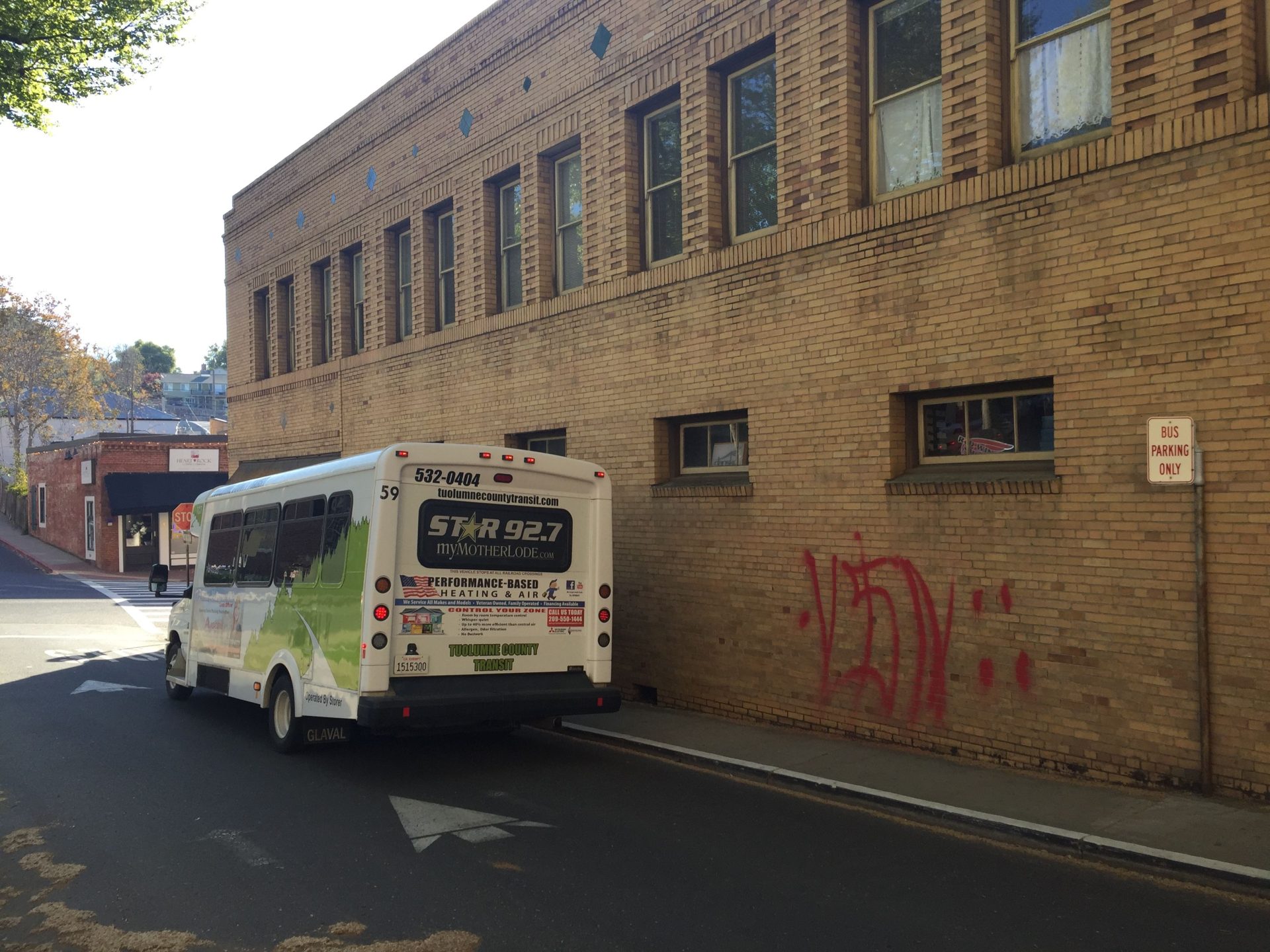 The most visible location this morning is a building on Washington Street, near the bus stop, next to courthouse park. The PD reports that other confirmed locations include the a retaining wall at the intersection of Mono Way and Hospital Road, at the Gold Country Gas, the Courthouse building at 60 North Washington Street, at 38 South Stewart Street, and along William Street.