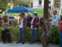 Sonora, CA– Traffic was slow through Sonora most of the day, first for Occupy Sonora then because of Zombies. 40 protesters were still lined up at Courthouse Park along North Washington chanting “End corporate greed!” with many other signs at 2:30pm. A few zombies were having make-up applied and beginning to collect at the park at that time as well. By 4:30pm there was a full park of zombies dancing to Michael Jackson’s “Thriller”.