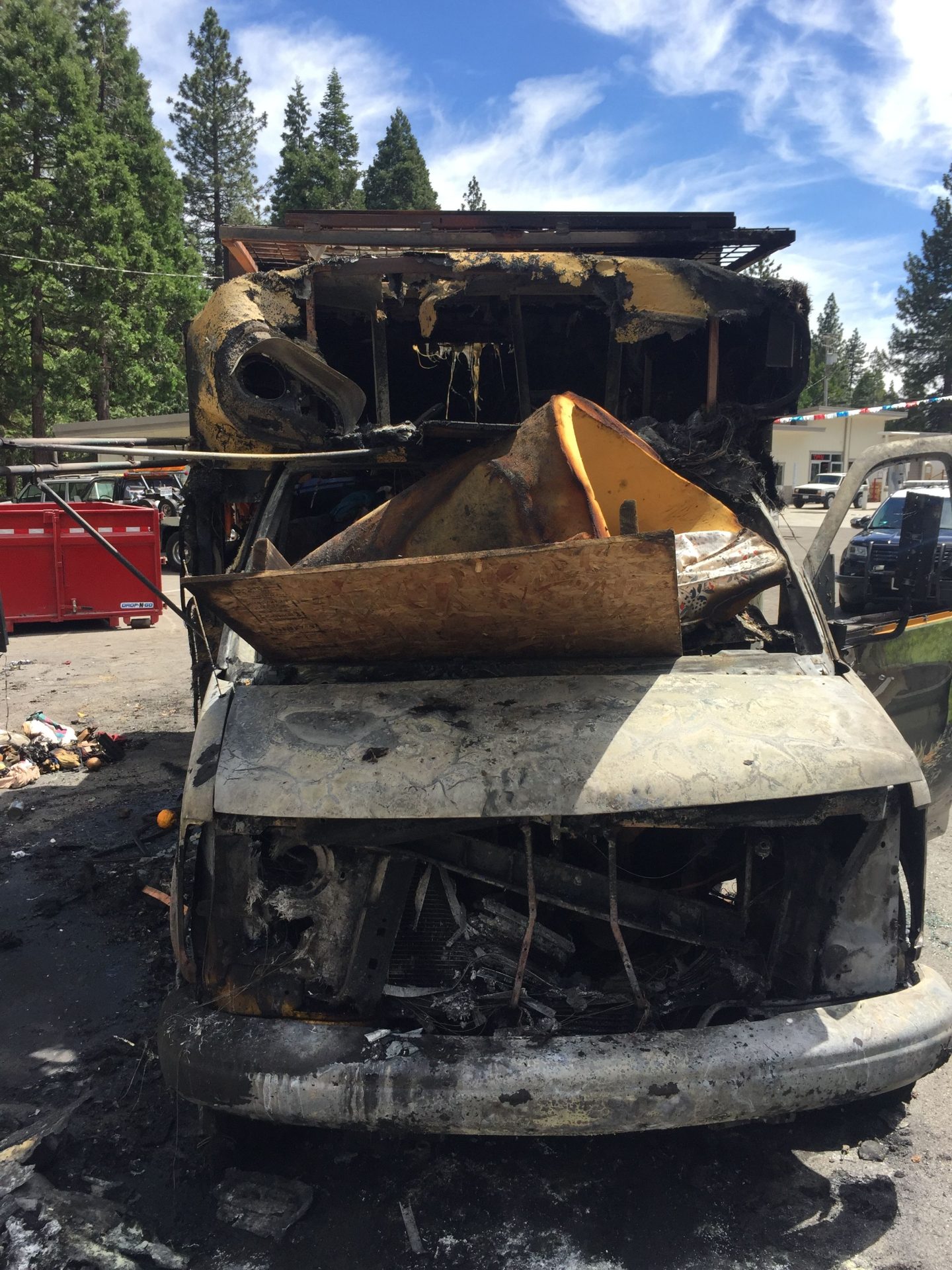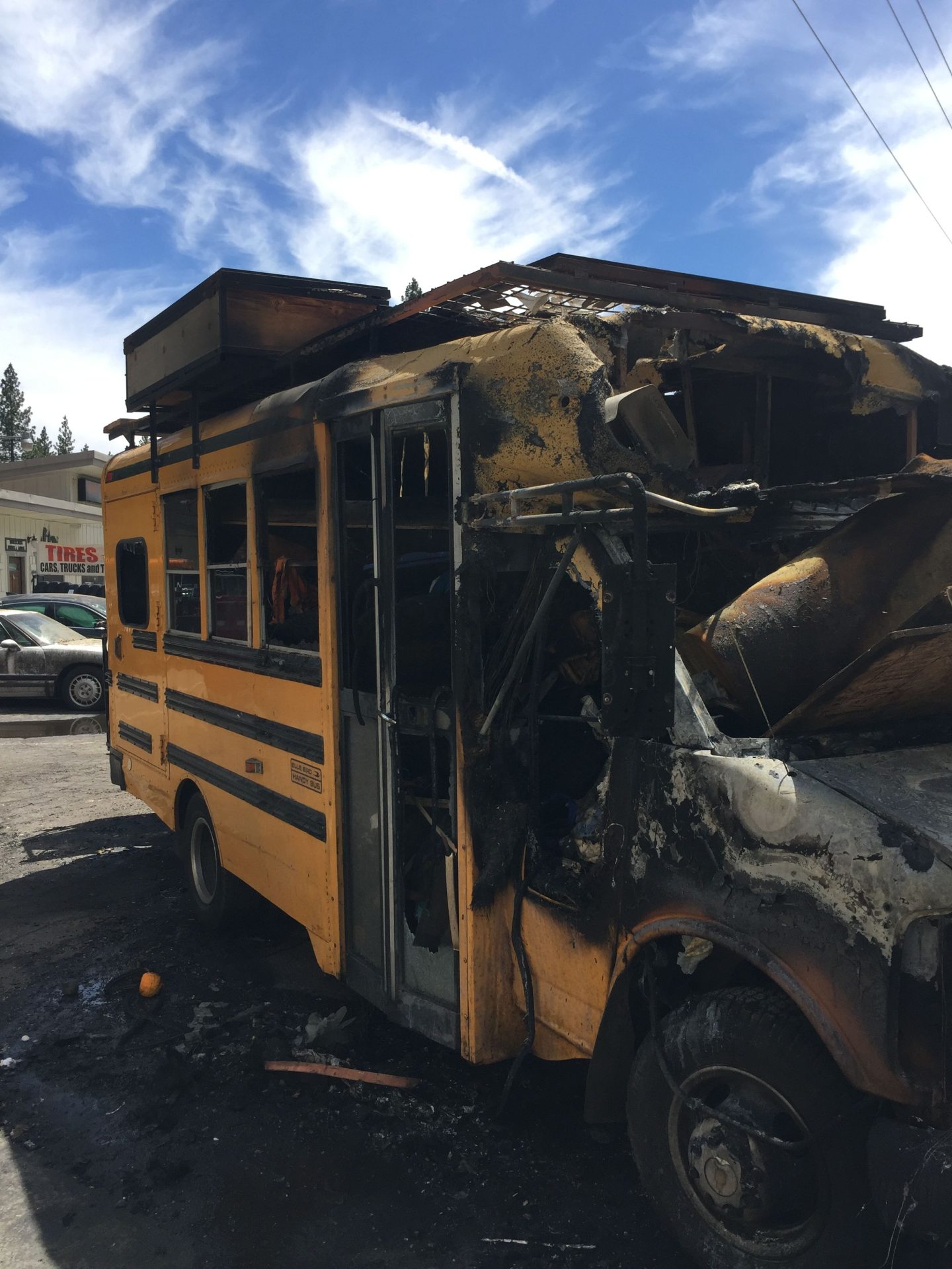 Just before noon on Thursday, firefighters were called to the Cheveron Station in Sierra Village along Highway 108, as detailed here. When they arrived flames were shooting out from under the hood and the front of the small yellow school bus was engulfed. Observing from a short distance away, the owner of the bus turned RV, Daisy Dresner from San Francisco, could only watch as his dream of traveling the country went up in flames.