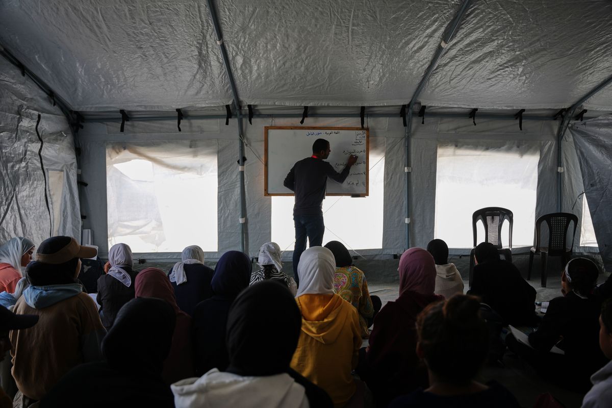 At one school — a cluster of tents with the UNICEF logo erected on a patch of land amid bombed-out buildings in the southern city of Khan Younis — children huddled closely in one classroom, eagerly listening to their teacher.