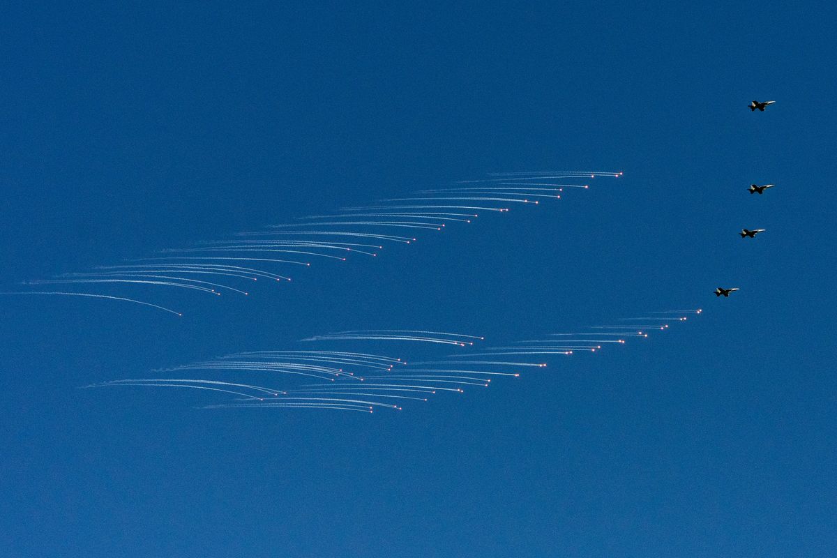 In addition to the live bomb demonstration, Navy destroyers launched missiles and fired shells into the Atlantic Ocean, and Navy SEALs descended from helicopters and fighter jets catapulted off vessels.