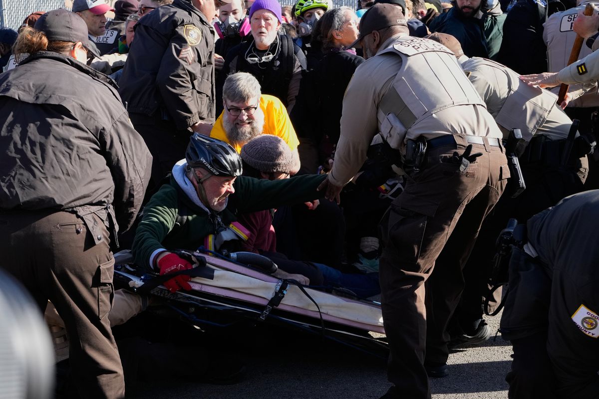 Just moments before the clash, demonstrators were singing and chanting. Around 10 a.m., a large group, knowing they were going to be arrested, allegedly crossed the protest barrier and attempted to walk up toward the U.S. Immigration and Customs Enforcement facility.