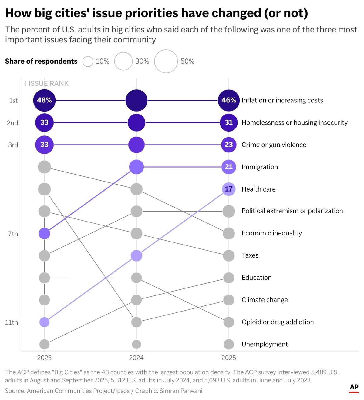 Yet data shows most violent crime in those places, and around the country, has declined in recent years. That tracks with the poll, which found that residents of America’s Big Cities and Middle Suburbs are less likely to list crime or gun violence among the top issues facing their communities than they were in 2023.