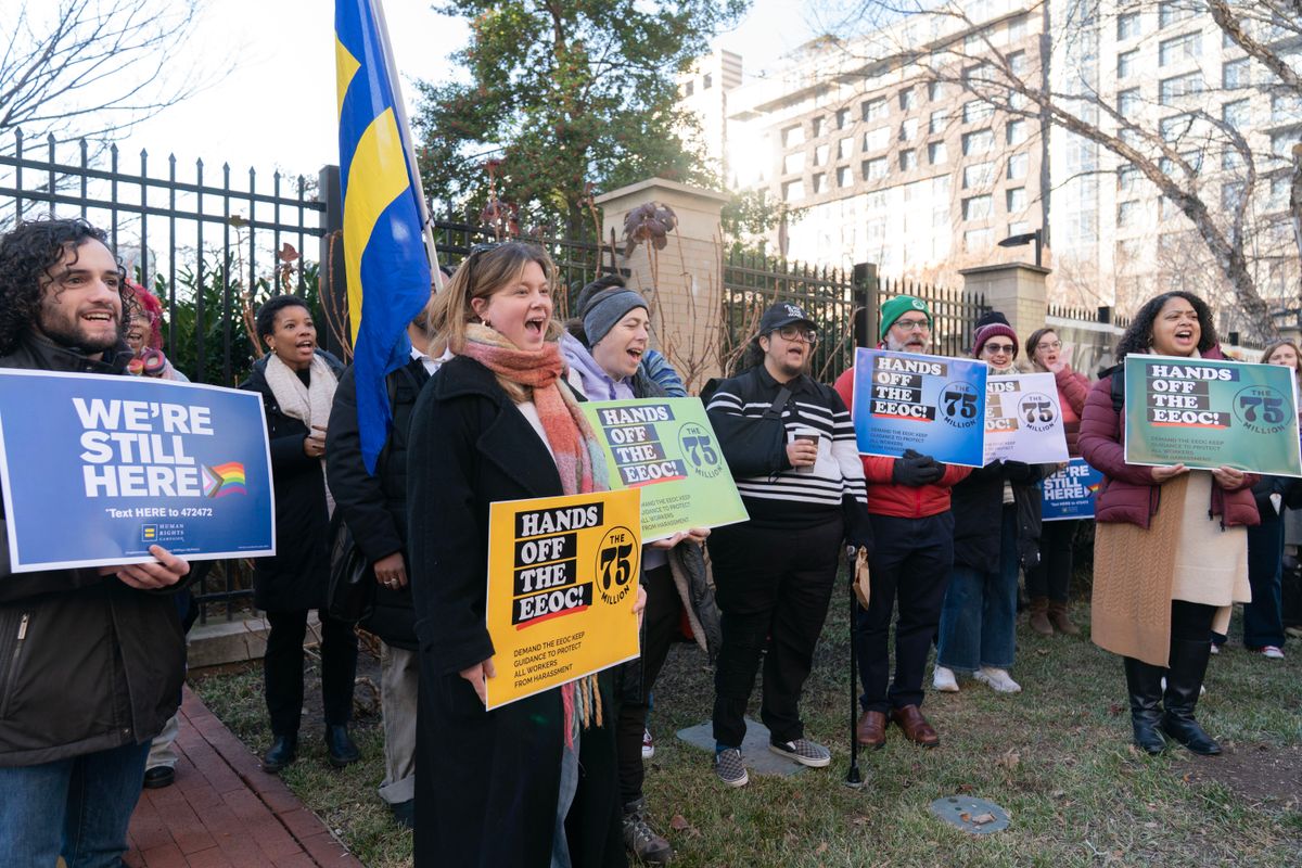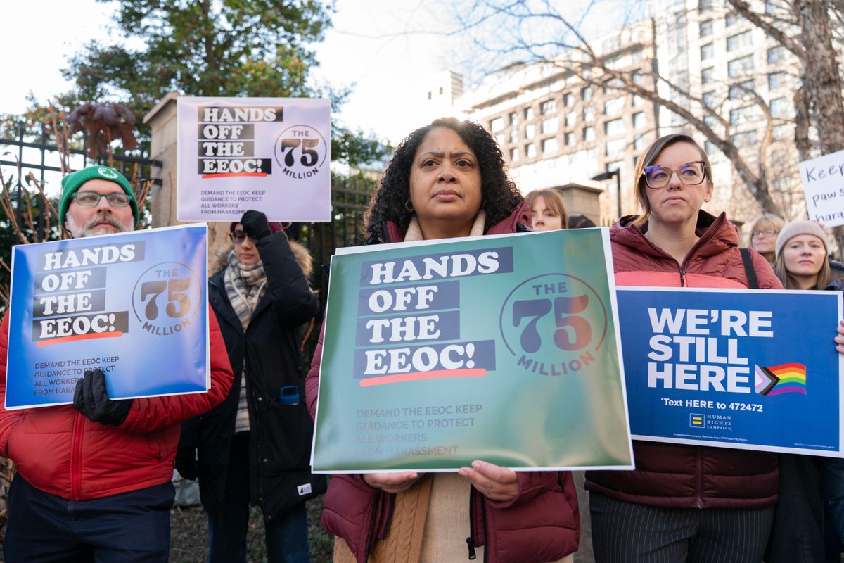 A few dozen protesters clustered outside the EEOC building on Thursday morning before the meeting, holding signs demanding “hands off the EEOC” and waving flags bearing the blue-and-yellow equality logo for LGBTQ+ rights group Human Rights Campaign.