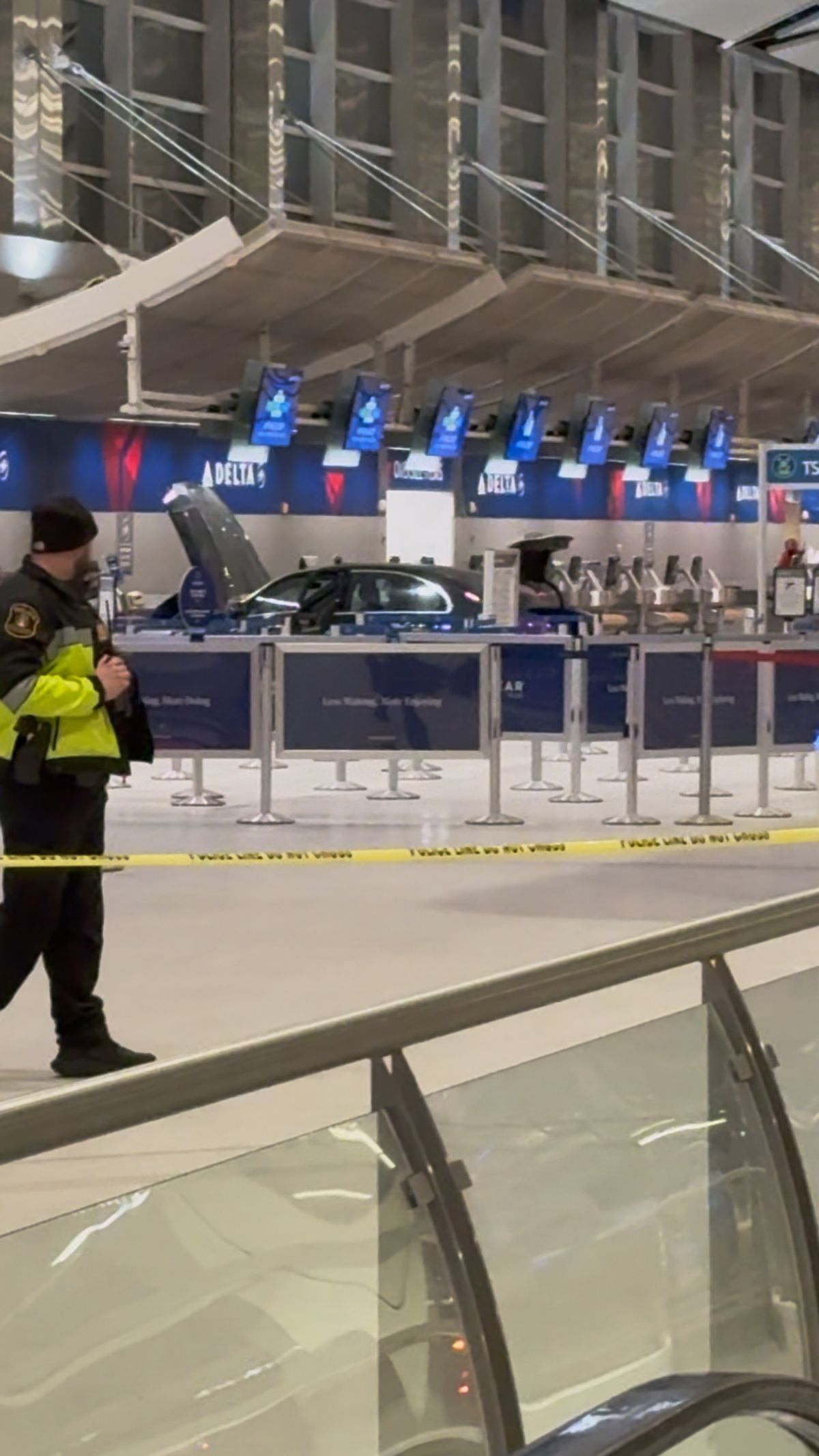 Video posted on social media showed a blue, four-door sedan stopped, with its hood and truck popped open, in front of Delta Air Lines counters in what appeared to be a departure lobby.
