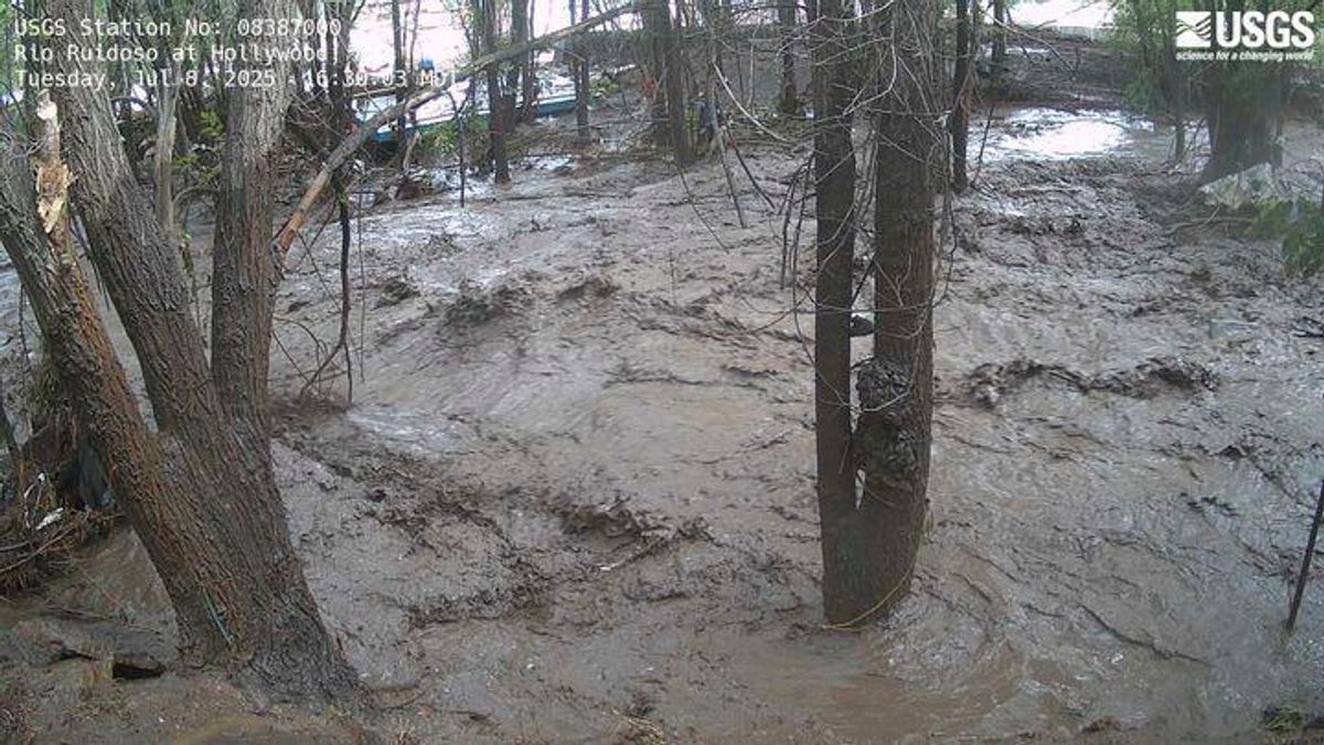 A U.S. Geological Survey gauge along the Rio Ruidoso, located just north of a commercial district along U.S. Highway 70, recorded a water level increase from 1.5 feet (0.45 meters) to nearly 6 feet (1.8 meters).