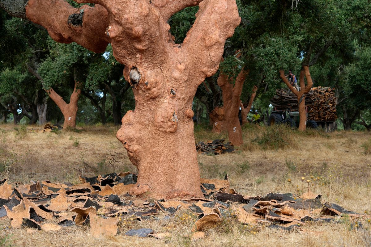 Once the trees were bare, a woman painted a white “5” on the orange-colored trunks, signaling they were stripped in 2025. Herdade de Rio Frio’s cork oaks, which are native to Portugal and can resist frequent droughts and scorching summer temperatures, were planted more than a century ago.