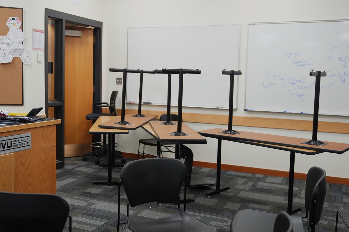 Some attendees who bolted after the gunshot rushed into two classrooms full of students, where the periodic table adorned the wall and formulas were written in blue on the whiteboard. They pulled tables from the center of the room to barricade the door, stacking them atop each other. Others were turned on their side in a corner for a last ditch defense.
