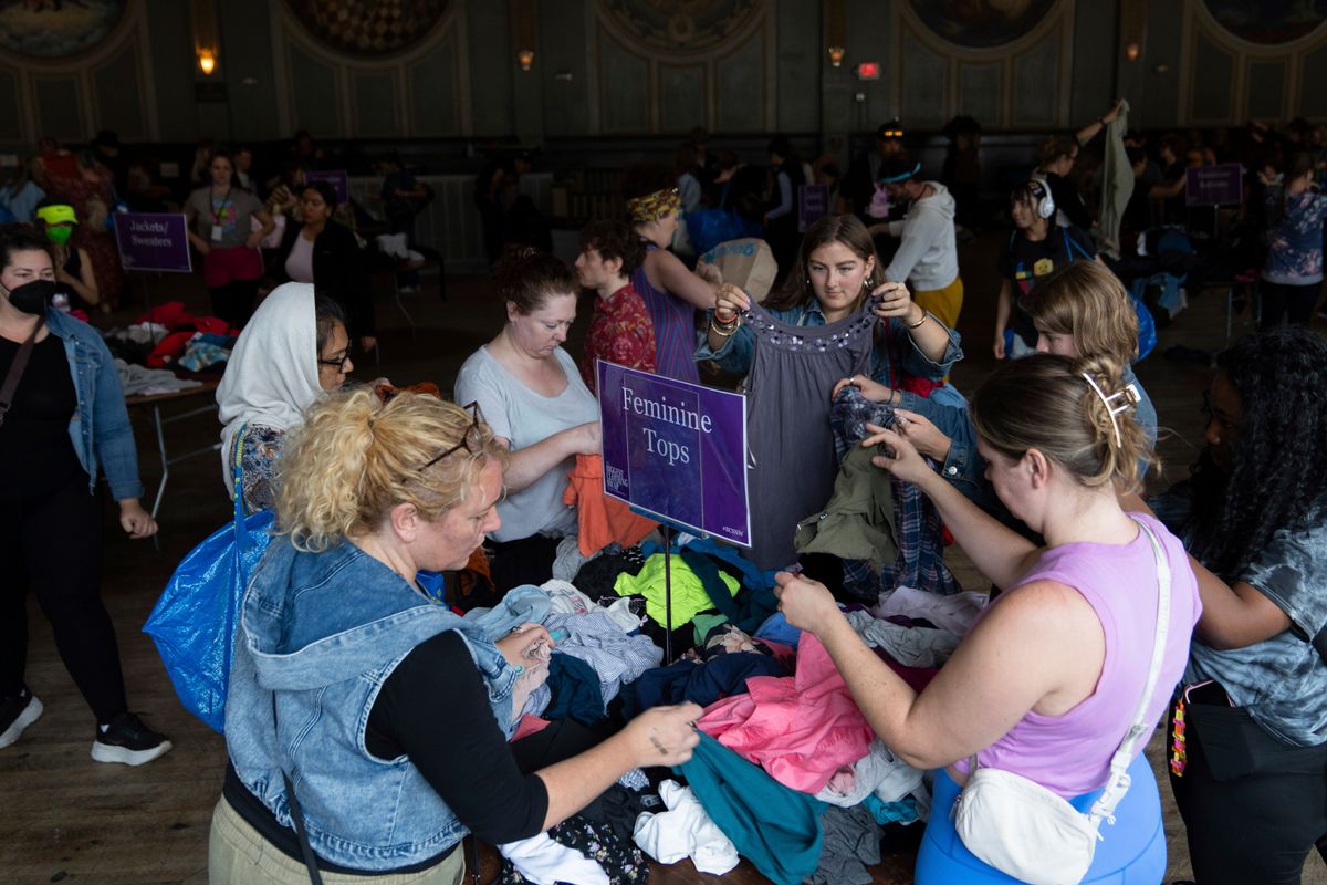 The Portland event asks for a $10 entry fee to cover costs, but the clothes are free and there’s no limit to how much participants can take. People bring their gently used clothing, shoes and accessories to a sorting station, where volunteers sort it into bins and onto tables.