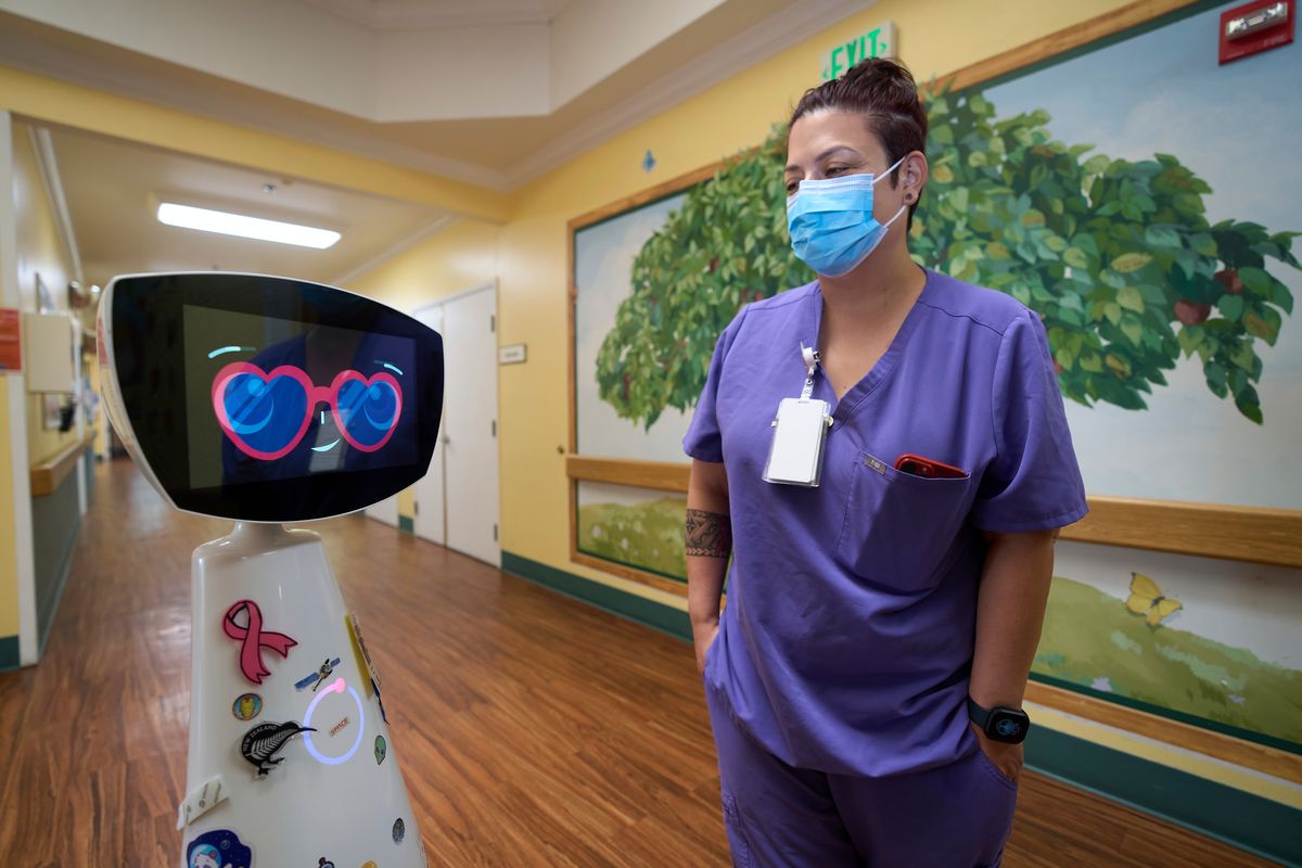 The robot with a sleek white triangle-shaped frame that Khachikyan said was designed for hugging, rolled into a room with a teenager injured in a car accident. The robot played what it described as his favorite song — “No Fear” by DeJ Loaf — and he danced along. In the hallway, Robin cracked up a young child held by her mother when it put on a series of silly glasses and a big red nose. In another room, the robot played a simplified version of tic-tac-toe with a patient.