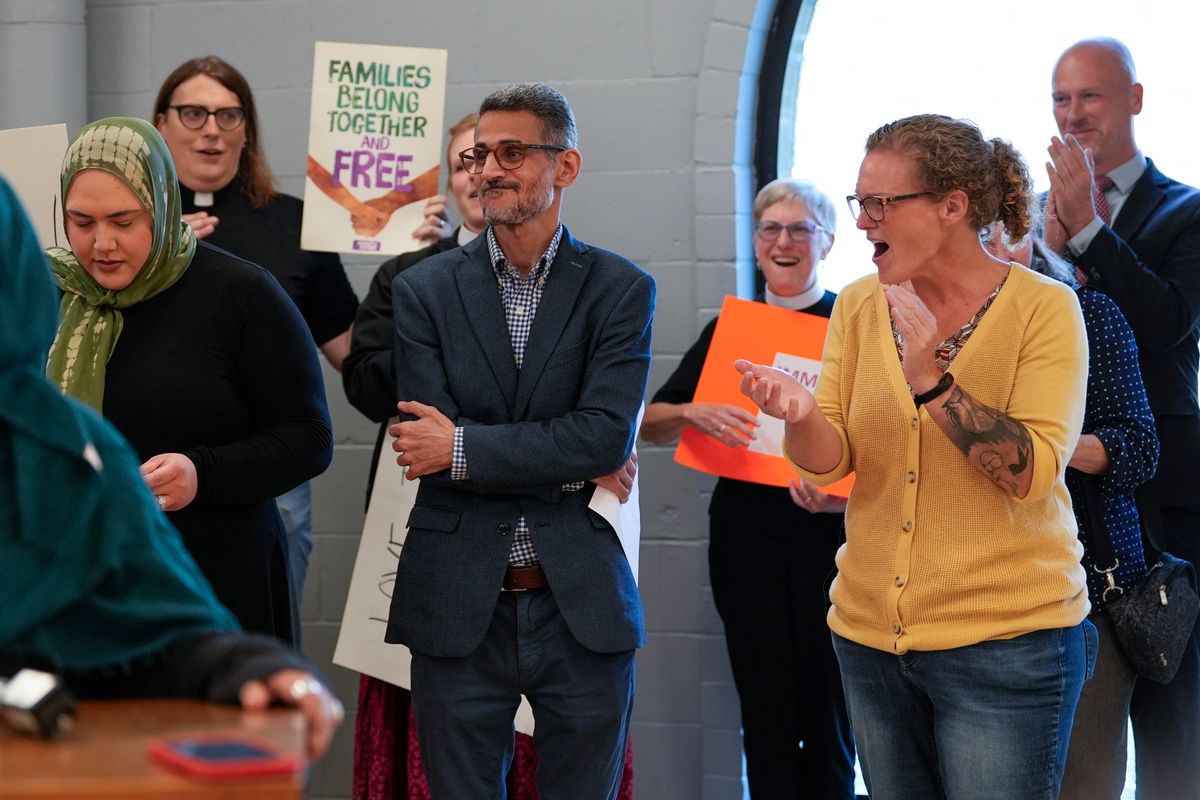 “I can’t find words to describe this moment. This is beyond a dream,” he said, as supporters including religious leaders and children held up signs reading “Finally Home,” “Home Is Here,” and “Immigrants Welcome here.” “I will always be indebted to every one of you.”